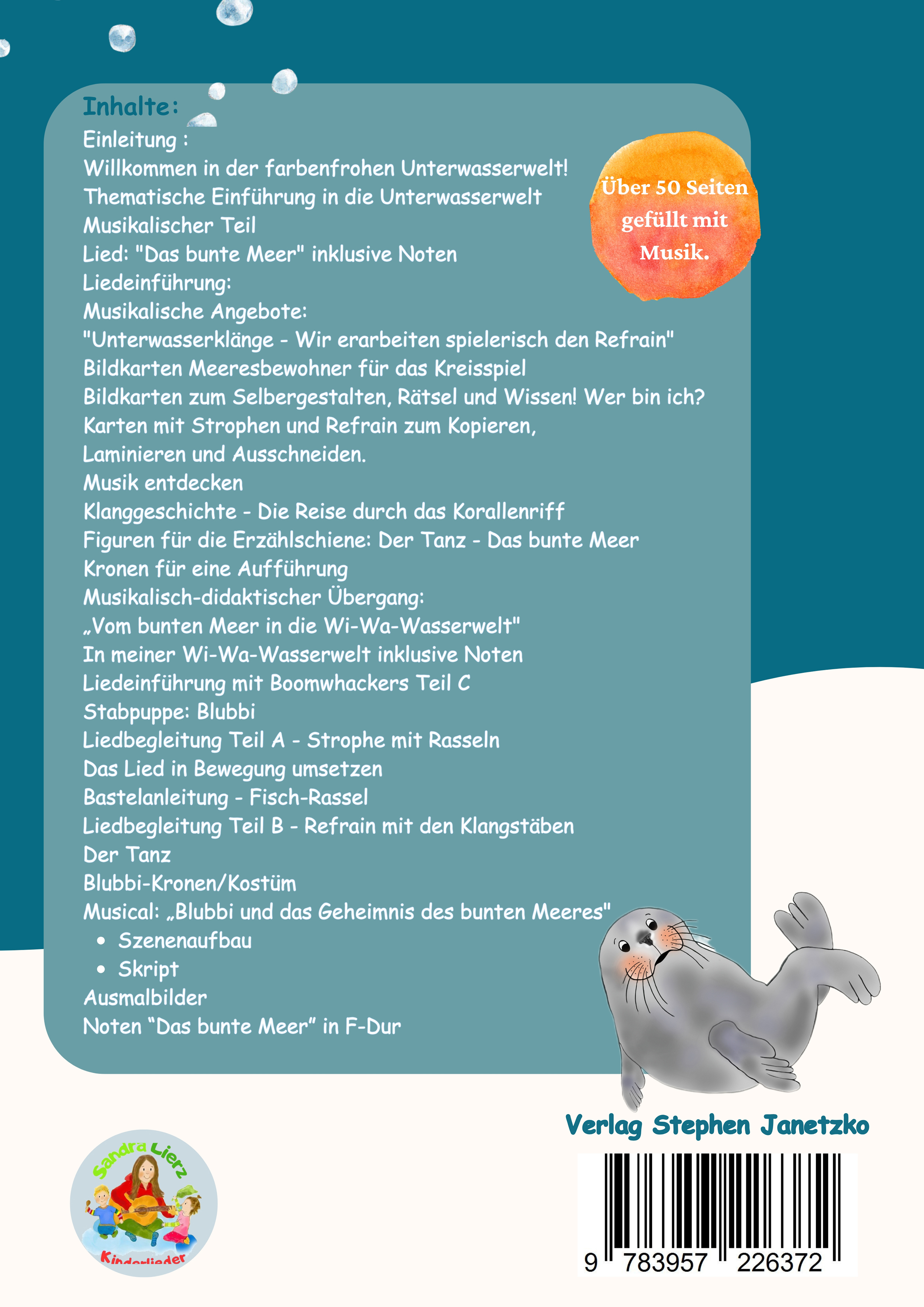 KlangKISTE: Das bunte Meer - Kita & Grundschul-Projekt mit umfangreicher Materialsammlung inklusive farbiger Kopiervorlagen, Noten und mehr! QR-Codes zu den Liedern und Videos bei spotify oder anderen Portalen enthalten. Das musikalische Projektbuch mit allen Texten, Noten und Gitarrengriffen zum Mitsingen & Mitspielen für Krippe, Kita, Musikschule & Grundschule. Über 50 Seiten gefüllt mit Musik. Tauche mit deiner Kita- oder Grundschulgruppe in eine fantasievolle, musikalisch - kreative Reise unter die Meeresoberfläche ein! Dieses Projektbuch lädt Kinder dazu ein, das Leben im Ozean mit allen Sinnen zu entdecken - durch Lieder, kreative Gestaltungen, Bewegung, Spiel und schließlich einer kleine Aufführung. Im Mittelpunkt stehen die beiden mitreißenden Lieder "Das bunte Meer" und "In meinerWi-Wa-Wasserwelt" von Sandra Lierz und Stephen Janetzko. Sie bilden das Herzstück des Projekts und werden Schritt für Schritt musikalisch erarbeitet - durch Singen, rhythmisches Begleiten und einfache Bewegungen. Begleitend dazu fördern bunte Kopiervorlagen das kreative Gestalten und Basteln rund um Muscheln, Quallen, Fische, und andere Meeresbewohner. Das Projekt ist so aufgebaut, dass es flexibel im Kita- oder Grundschulalltag eingesetzt werden kann - ob als mehrwöchiges Thema oder als Vorbereitung auf ein kleines Abschlussfest mit Eltern und Freunden. Die Materialien sind praxiserprobt, leicht umsetzbar und bieten vielfältige Impulse für einen spielerischen, musikalischen und kreativen Zugang zur Unterwasserwelt. Inhalte: Einleitung: Willkommen in der farbenfrohen Unterwasserwelt! Thematische Einführung in die Unterwasserwelt Musikalischer Teil Lied: "Das bunte Meer" inklusive Noten Liedeinführung: Musikalische Angebote: "Unterwasserklänge - Wir erarbeiten spielerisch den Refrain" Bildkarten Meeresbewohner für das Kreisspiel Bildkarten zum Selbergestalten, Rätsel und Wissen! Wer bin ich? Karten mit Strophen und Refrain zum Kopieren, Laminieren und Ausschneiden. Musik entdecken Klanggeschichte - Die Reise durch das Korallenriff Figuren für die Erzählschiene: Der Tanz - Das bunte Meer Kronen für eine Aufführung Musikalisch-didaktischer Übergang: "Vom bunten Meer in die Wi-Wa-Wasserwelt" In meiner Wi-Wa-Wasserwelt inklusive Noten Liedeinführung mit Boomwhackers Teil C Stabpuppe: Blubbi Liedbegleitung Teil A - Strophe mit Rasseln Das Lied in Bewegung umsetzen Bastelanleitung - Fisch-Rassel Liedbegleitung Teil B - Refrain mit den Klangstäben Der Tanz Blubbi-Kronen/Kostüm Musical: "Blubbi und das Geheimnis des bunten Meeres" Szenenaufbau Skript Ausmalbilder Noten "Das bunte Meer" in F-Dur