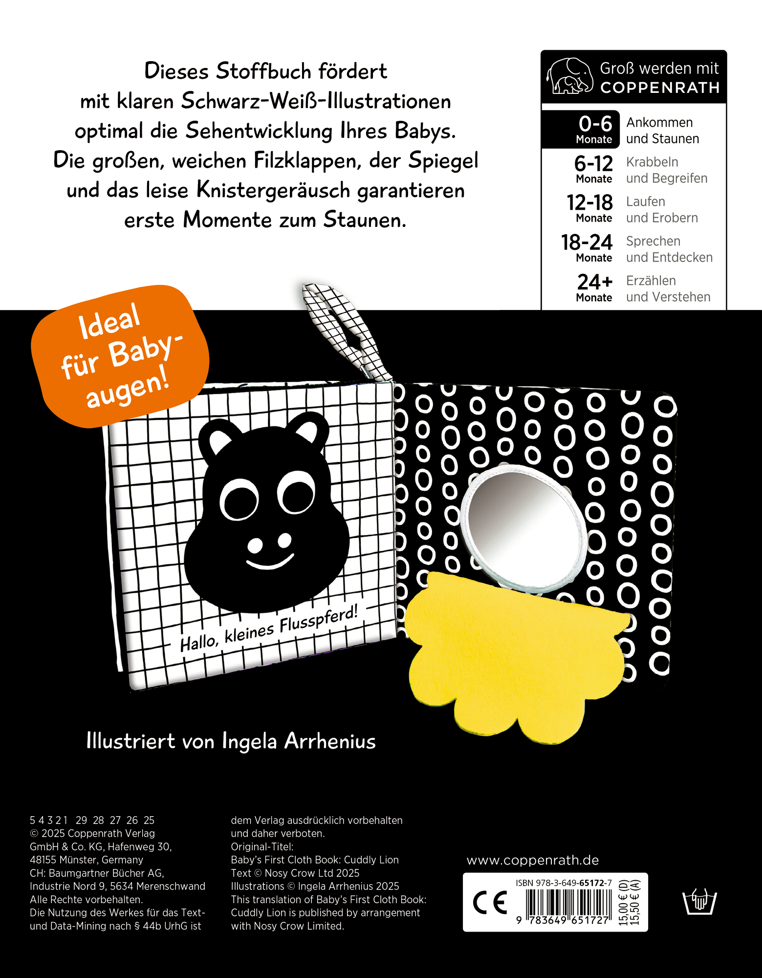 „Babys kuschelweiches Kontrastbuch: Löwe" ist das ideale erste Stoffbuch für Babys ab Geburt. Die klaren Schwarz-Weiß-Kontraste unterstützen die frühkindliche Sehentwicklung, während bunte Filzklappen, ein integrierter Spiegel und sanftes Knisterpapier erste Sinneseindrücke vermitteln. Dank Befestigungsband mit Klettverschluss ist das Buch auch unterwegs immer dabei – perfekt für Kinderwagen oder Babyschale.