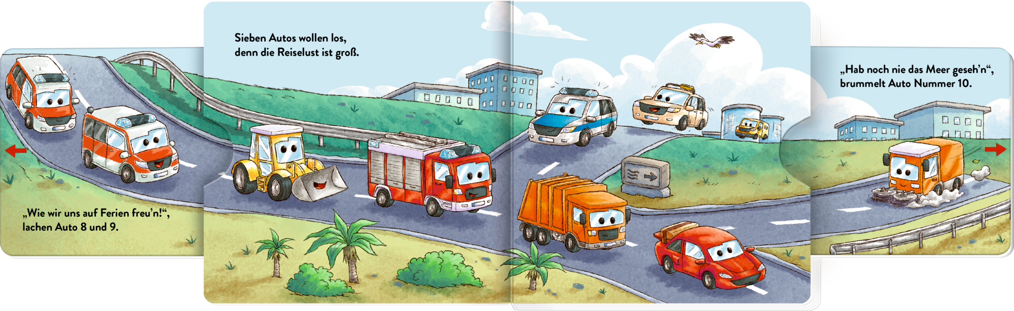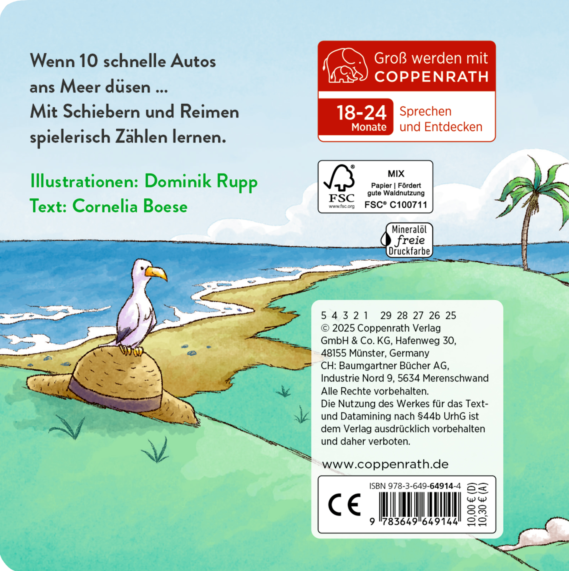 In Wer will schnelle Autos sehn? begleiten Kinder zehn bunte Autos auf ihrem fröhlichen Weg ans Meer. Mit beweglichen Schiebern, charmanten Reimen von Cornelia Boese und den farbenfrohen Illustrationen von Dominik Rupp entsteht ein rasantes Pappbilderbuch voller Mitmachmomente. Das Zählen von 1 bis 10 wird hier spielerisch gefördert – ideal für kleine Rennfahrerinnen und -fahrer, die Fahrzeuge lieben und dabei die Welt der Zahlen entdecken möchten.