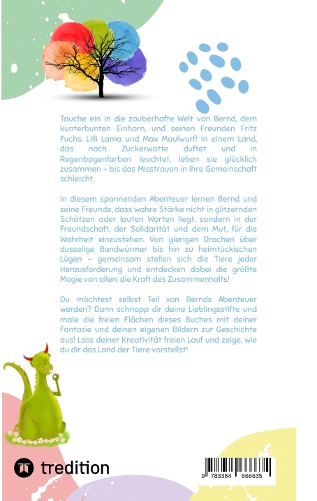 Die Geschichte beginnt im bunten Land von Bernd dem Einhorn, wo Freundschaft und Tauschhandel das Leben bestimmen. Doch dann erscheint Ignaz der Drache, der mit einem glitzernden Stein das Verlangen nach Besitz und individuellem Wert weckt. Dies führt zu Isolation und Unglück unter den Tieren, bis Bernd und seine Freunde erkennen, dass wahre Stärke in der Gemeinschaft liegt und Ignaz sich wandelt.Kurz darauf wird das Land von Donald, dem dämlichen Bandwurm, angegriffen, der mit dummer Gier und zusammenhanglosem Quatsch für Chaos sorgt. Die Tiere besiegen ihn nicht durch Kampf, sondern durch gemeinsame Anstrengung und Kreativität, was ihren Zusammenhalt erneut stärkt.Die Nachricht von dieser starken Gemeinschaft beunruhigt die bösen Tiere, angeführt vom Teufel Chino Durchfalla. Sie versuchen, die Gemeinschaft durch das Verbreiten von Lügen und Misstrauen zu zerstören, was tatsächlich zu Unfrieden und Streit unter den Tieren führt. Doch aus dem Untergrund kämpfen Bernd und seine Freunde unermüdlich für die Wahrheit und Aufklärung.Schließlich erkennen die Tiere die Lügen und finden durch Freundschaft und Solidarität wieder zusammen. Sie besiegen Chino Durchfalla und seine Bande, indem sie sich geeint gegen die Spaltung wehren. Die Geschichte endet mit der Erkenntnis, dass Gemeinschaft, Solidarität und der Kampf für Gerechtigkeit die wahren Werte sind, die zu einem glücklichen und erfüllten Leben führen.