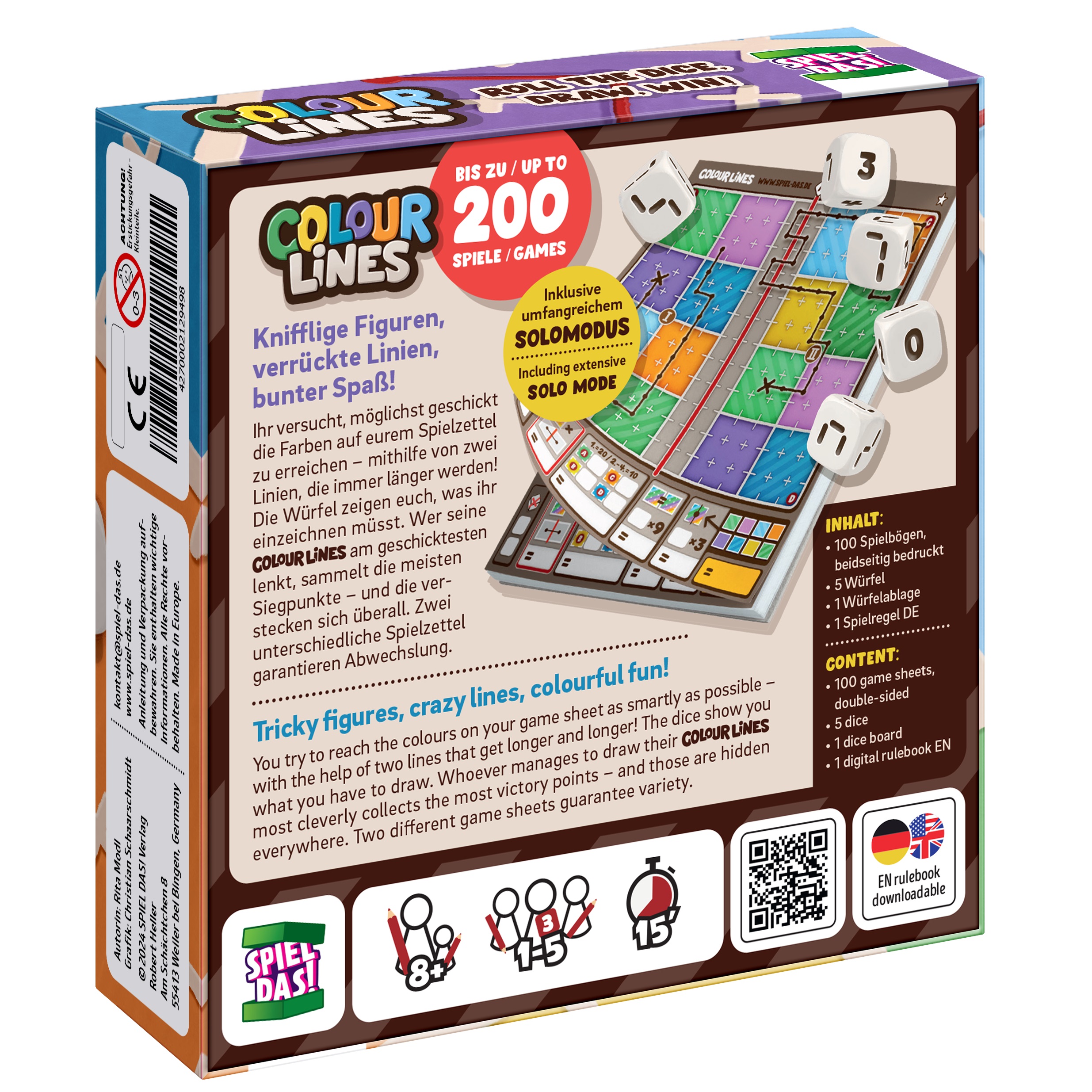 Knifflige Figuren, verrückte Linien, bunter Spaß! Bei COLOUR LINES versucht ihr, möglichst geschickt die verschiedenen Farben auf eurem Spielzettel zu erreichen – mithilfe von zwei Linien, die im Laufe des Spiels immer länger werden! Die Würfel zeigen euch, was ihr einzeichnen müsst – das können auch mal knifflige Figuren sein. Wer seine COLOUR LINES am geschicktesten durch die Farben manövriert, sammelt die meisten Siegpunkte – und die verstecken sich überall. Ein herausfordernder Solomodus, mehrere Varianten und zwei unterschiedliche Spielzettel garantieren jede Menge Abwechslung.
