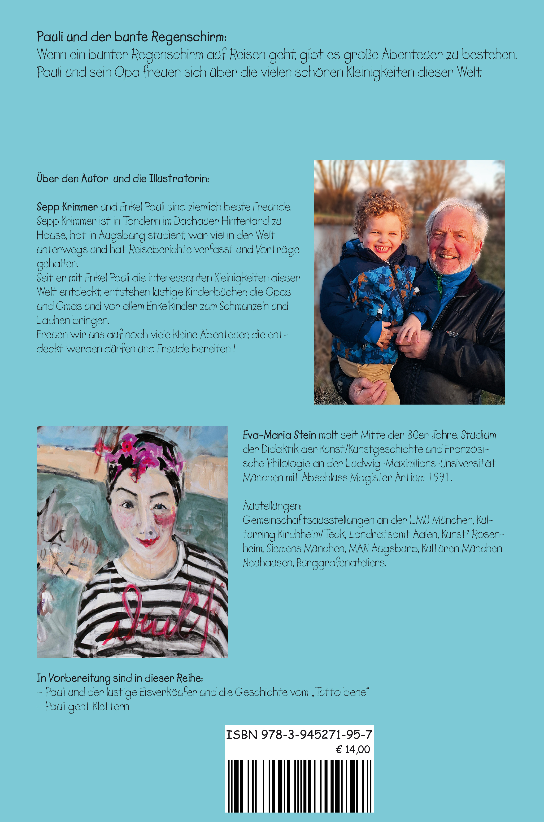 Sepp Krimmer und Enkel Pauli sind ziemlich beste Freunde. Sepp Krimmer ist in Tandern im Dachauer Hinterland zu Hause, hat in Augsburg studiert, war viel in der Welt unterwegs und hat Reiseberichte verfasst und Vorträge gehalten. Seit er mit Enkel Pauli die interessanten Kleinigkeiten dieser Welt entdeckt, entstehen lustige Kinderbücher, die Opas und Omas und vor allem Enkelkinder zum Schmunzeln und Lachen bringen. Freuen wir uns auf noch viele kleine Abenteuer, die entdeckt werden dürfen und Freude bereiten !