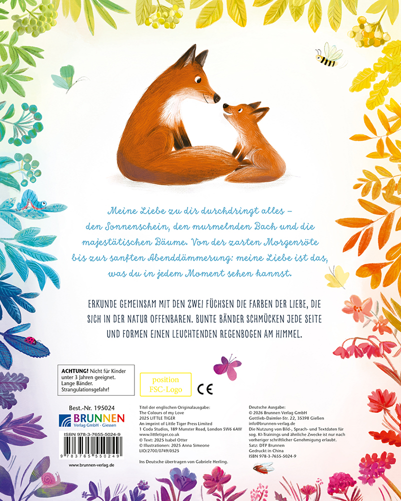 In jeder Situation spürt der kleine Fuchs die Geborgenheit und Liebe seines großen Freundes. Durch diese gemeinsamen Momente lernt er, Neues zu wagen und die Welt mit offenen Augen zu sehen. Die Farben des Regenbogens stehen dabei symbolisch für die tiefe Liebe, die die beiden verbindet.