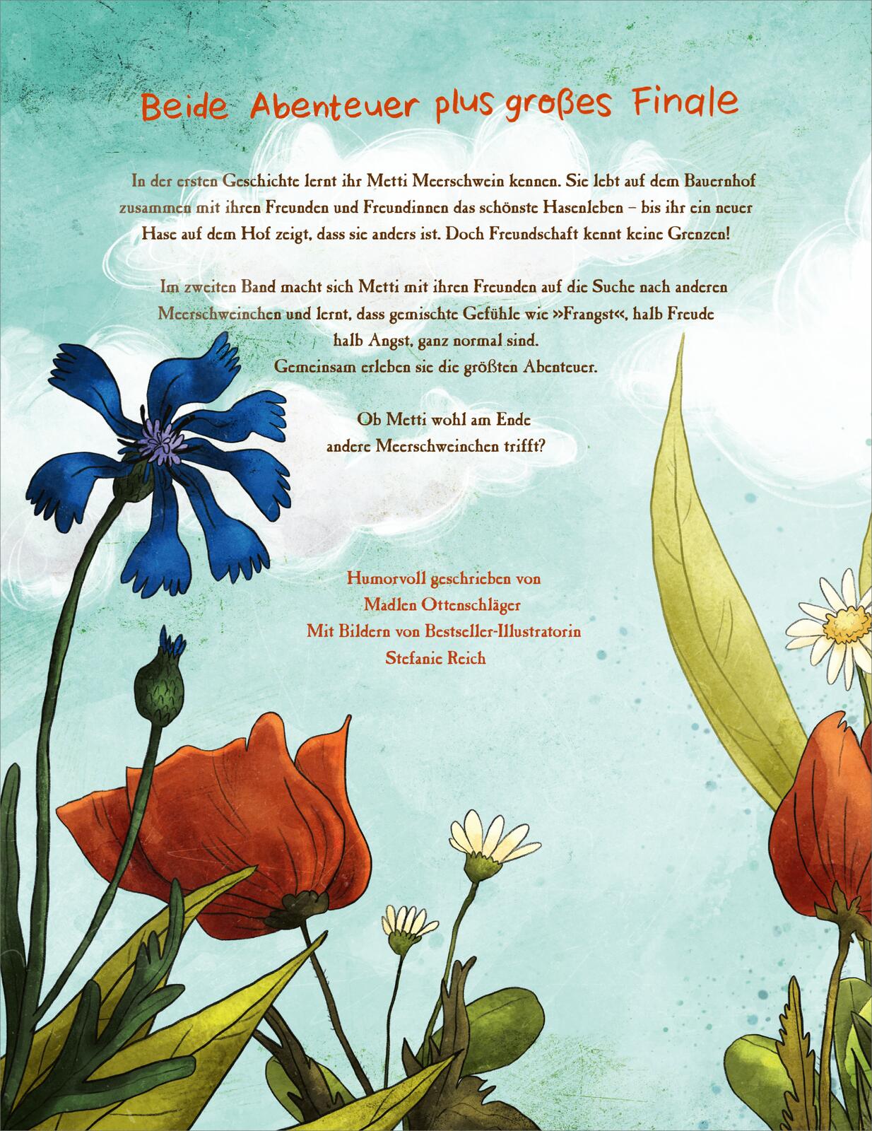 Im zweiten Abenteuer zwickt es plötzlich in Metti Meerschweins Bauch: das sind die Neugier und die Sehnsucht. Metti will sich aufmachen und andere Meerschweinchen finden! Ihre besten Freunde Hedi und Oskar begleiten sie natürlich. Zusammen erleben sie die abenteuerlichsten Abenteuer, meistern Gefahren und schließen neue Freundschaften! Und sie lernen, dass gemischte Gefühle wie "Frangst" - eine Mischung aus Freude und Angst - ganz normal sind.