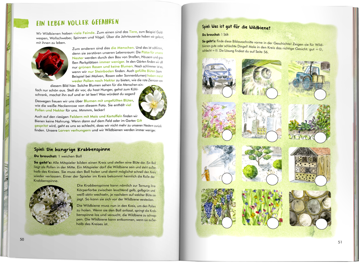 Die kleine Wildbiene Mia besucht ihre Cousine Melli in der großen Stadt. Sie erlebt, wie Honigbienen dort Nahrung finden. Gleichzeitig erkennt Mia aber auch, welche Gefahren in der Stadt lauern. Vom Heimweh geplagt, macht sie sich zusammen mit Melli auf den Rückweg. Auf dem Land zeigt sie Melli, wie vielfältig Wildbienen leben. Aber auch hier herrscht keine heile Welt...Im Anschluss an die Geschichte vermittelt die Autorin und erfahrene Pädagoginin einem "Erlebnis-Workshop" Details über die Lebensweise der Wildbienen. Diese lockert sie durch Spiel- und Bastelideen. Wie man den Wildbienen auch schon mit kleinen Dingen helfen kann, zeigt sie mit einfachen Bauanleitungen für Nisthilfen. Das bunte Würfelspiel lässt die ganze Familie am Leben der Wildbienen teilhaben.