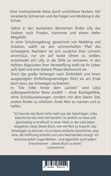 Lilly ist ein empathisches Mädchen, das sich nach Frieden, Harmonie und echtem Mitgefühl sehnt. Doch ihre Schulzeit verwandelt sich allmählich in einen Albtraum. Was mit harmlosen Hänseleien beginnt, eskaliert langsam zu Mobbing, bis hin zu körperlicher Gewalt. Inmitten dieses schmerzhaften Prozesses zieht sich Lilly immer weiter zurück und versteckt ihre wahren Gefühle hinter einem Lächeln. Dieses Lächeln wird zu ihrer Maske, hinter der sie ihre Verzweiflung und den inneren Schmerz verbirgt - eine stille, aber erdrückende Fassade, die niemanden über ihre inneren Kämpfe täuscht.Als sie sich ihrer Lehrerin anvertraut, hofft Lilly auf Hilfe, doch ihre Worte verhallen ungehört. Enttäuscht und verletzt entscheidet sich Lilly, zu schweigen. In der Stille versucht sie, den Schmerz allein zu bewältigen, bis ihre Verzweiflung so groß wird, dass sie ihr eigenes Leben infrage stellt.Doch tief in ihrem Inneren brennt der Wunsch nach Ehrlichkeit. Der starke Drang, anderen Kindern zu helfen und sie vor dem gleichen Leid zu bewahren, lässt Lilly den Mut fassen, das Schweigen zu brechen."Die Stille hinter dem Lächeln" erzählt die eindrucksvolle Reise eines Mädchens, das sich aus der Dunkelheit erhebt - ohne Rache oder Vorwürfe, sondern mit einem tiefen Streben nach Wahrheit, Mut und Mitgefühl. Lillys Geschichte ist ein kraftvoller Appell für mehr Achtsamkeit im Umgang miteinander und für den Mut, sich selbst treu zu bleiben.