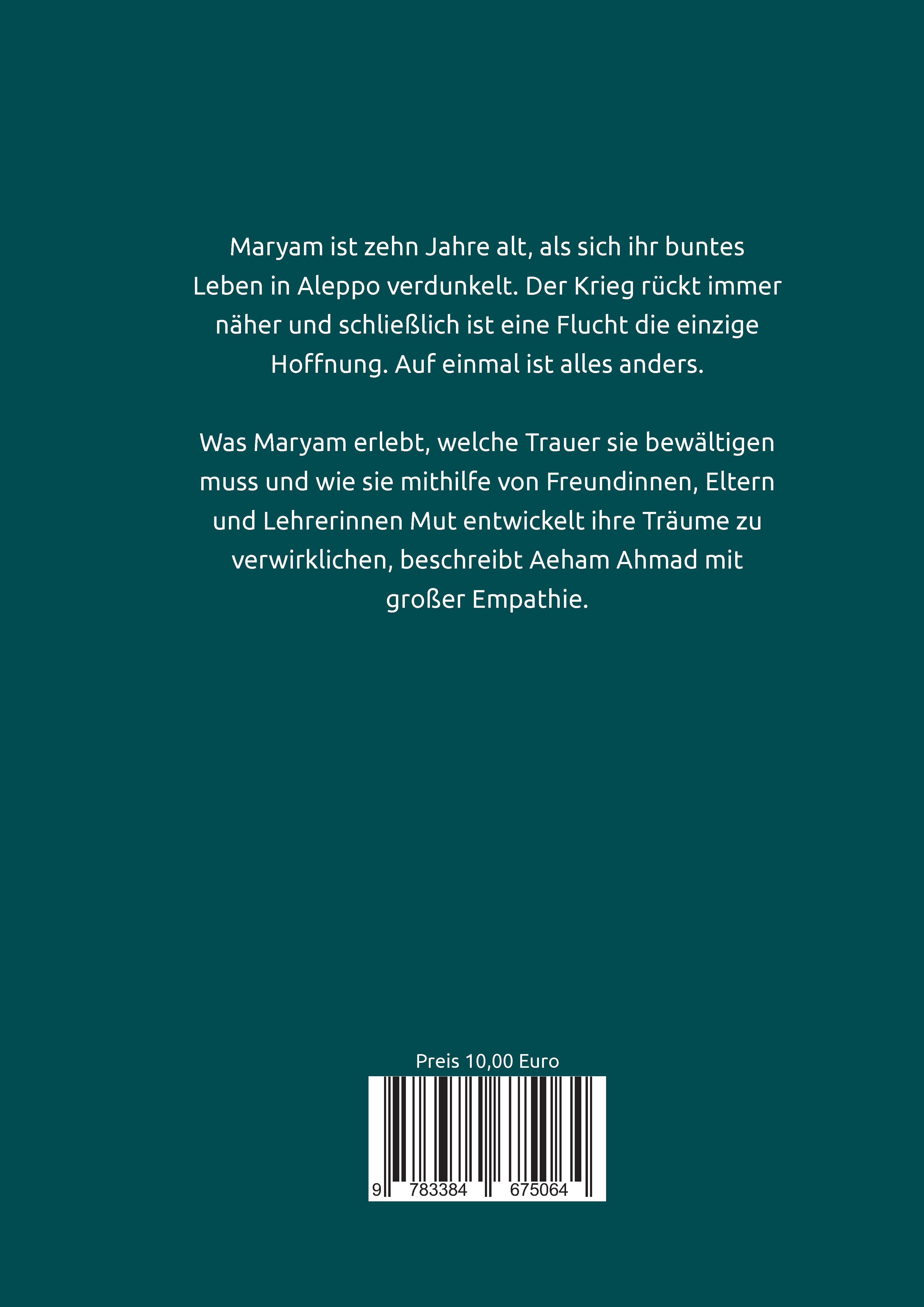 Maryam ist zehn Jahre alt, als sich ihr buntes Leben in Aleppo verdunkelt. Der Vater, ein Schreiner, macht sich Sorgen um die Zukunft seines Landes. Auch die Mutter, eine Schneiderin, verzweifelt zunehmend, da ihr Bruder seit Wochen vermisst wird. Noch gibt es für Maryam die Schule und ihren kleinen Bruder, mit dem sie ein fröhliches Leben teilt. Der Krieg rückt immer näher und schließlich ist eine Flucht die einzige Hoffnung. Maryam soll eine kleine Tasche packen, mit all den Dingen, die ihr besonders wichtig sind. So beginnt ein langer und gefährlicher Weg. Auf einmal ist alles anders.Ein fremdes Land, eine fremde Sprache, andere Gewohnheiten, andere Regeln. Was Maryam erlebt, welche Trauer sie bewältigen muss und wie sie mithilfe von Freundinnen, Eltern und Lehrerinnen Mut entwickelt ihre Träume zu verwirklichen, beschreibt Aeham Ahmad mit großer Empathie. "Wir sind nicht nur Flüchtlinge! Wir wollen Teil einer guten Gemeinschaft sein!" Maryam und ihre Familie haben ihren Weg gefunden.