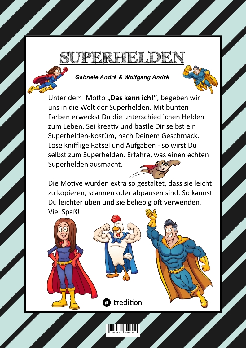 | Schlagworte | Alltagshelden • Ausmalen • Basteln • Cartoon • Craftbook • Eltern • Familie • Fantasie • Farben • Figuren • finden • Förderung • Freunde • Gestalten • Helden • Hero • Ideenfindung • Kostüm • Kreativität • Lernen • Lernphase • Lesen • Malen • Nachzeichnen • Rechnen • Schaffungsprozess • Schreiben • Spiele • Spielen • Suchen • Superhelden • Superhero • Tutorial • Wissenserweiterung • Wissenswertes • Wortschatz • wortsuche • Zeichnen |