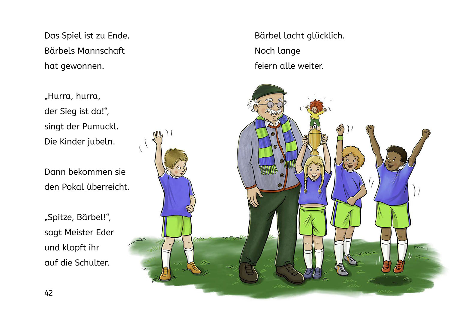 Das lustigste Fußballspiel aller Zeiten! Meister Eder nimmt Pumuckl zu einem wichtigen Spiel mit. Natürlich geht es auf dem Sportplatz bald drunter und drüber: Pumuckl schnappt einem Kind die halbe Bratwurst weg, wird spontan zum Stadionsprecher und stellt sich einfach selbst ins Tor. Warum wundern sich alle, dass der Fußball so komisch fliegt und die Halbzeitpause ungewöhnlich kurz ist? Am Ende bekommt Pumuckl von Meister Eder einen kleinen Pokal geschenkt. Großer Schabernack mit dem beliebten Kobold. Sechs lustige Kapitel in Fibelschrift – mit witzigen Reimen, tollen Pumuckl-Illustrationen und Leserätseln.