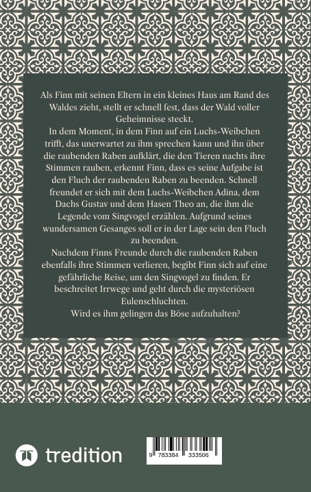Als Finn mit seinen Eltern in ein kleines Haus am Rand des Waldes zieht, stellt er schnell fest, dass der Wald voller Geheimnisse steckt. In dem Moment, in dem Finn auf ein Luchs-Weibchen trifft, das unerwartet zu ihm sprechen kann und ihn über die raubenden Raben aufklärt, die den Tieren nachts ihre Stimmen rauben, erkennt Finn, dass es seine Aufgabe ist den Fluch der raubenden Raben zu beenden. Schnell freundet er sich mit dem Luchs-Weibchen Adina, dem Dachs Gustav und dem Hase Theo an, die ihm die Legende vom Singvogel erzählen. Aufgrund seines wundersamen Gesanges soll er in der Lage sein den Fluch zu beenden. Nachdem Finns Freunde durch die raubenden Raben ebenfalls ihre Stimmen verlieren, begibt Finn sich auf eine gefährliche Reise, um den Singvogel zu finden. Er beschreitet Irrwege und geht durch die mysteriösen Eulenschluchten. Wird es ihm gelingen das Böse aufzuhalten?