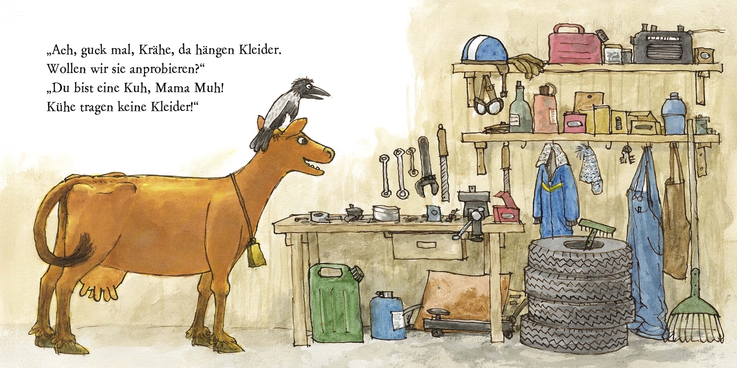Nanu, was ist denn das? Alte Kleider? Die müssen Mama Muh und die Krähe natürlich gleich anprobieren. Besser gesagt: Nur Mama Muh, denn Krähe behauptet, sie braucht mit ihren schönen Federn keinen Stoff. Aber vielleicht findet sich doch etwas, mit dem das Verkleiden so richtig Spaß macht …?