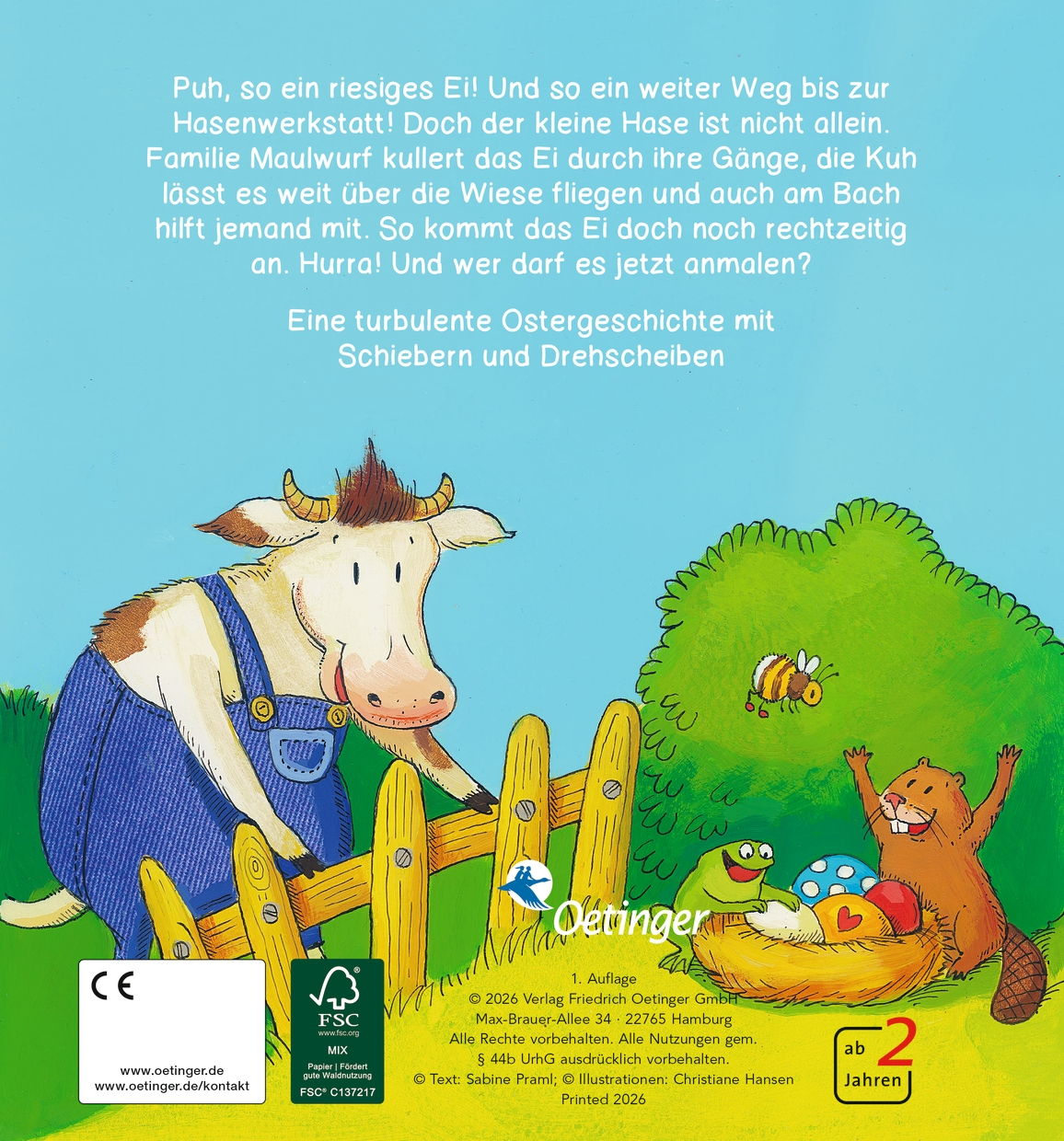 Puh, so ein riesiges Ei! Und so ein weiter Weg bis zur Hasenwerkstatt! Doch der kleine Hase ist nicht allein. Familie Maulwurf kullert das Ei durch ihre Gänge, die Kuh lässt es weit über die Wiese fliegen und auch am Bach hilft jemand mit. Mithilfe von Schiebern und Drehscheiben sorgen die Kinder dafür, dass das Ei an sein Ziel gelangt. Wie schön, dass der Hase Hilfe hat!