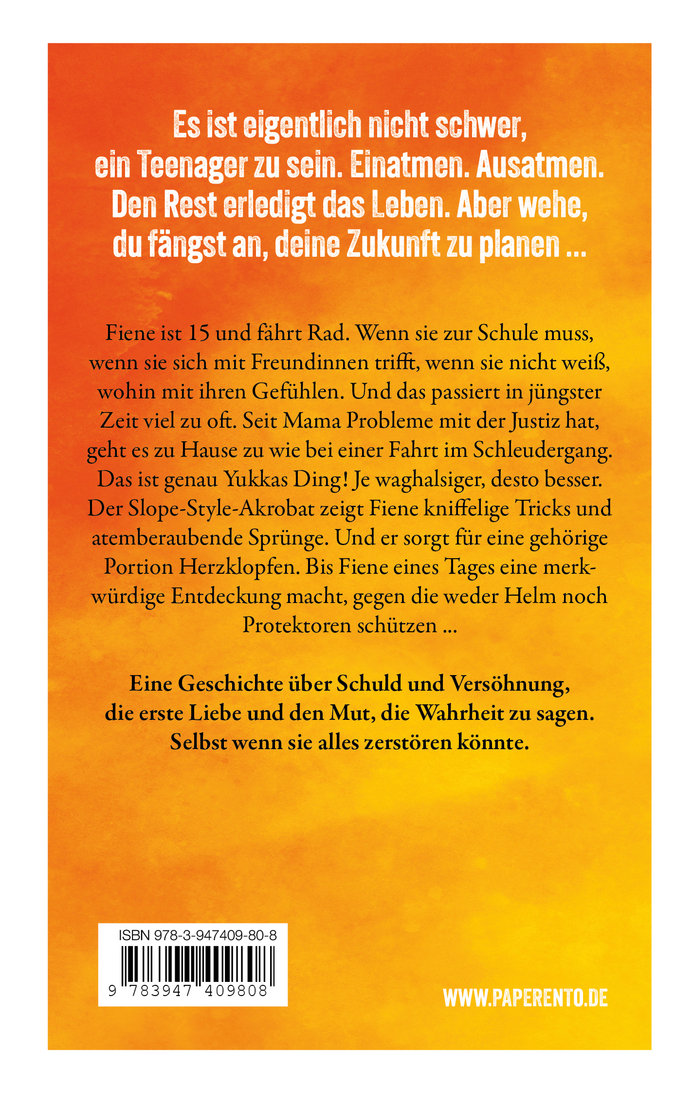 | Schlagworte | Coming-of-age • Elternteil im Gefängnis • Erste Liebe • Fahrerflucht • Familiengeheimnisse • Familienkrise • Freundschaft • Geschwisterbeziehung • Jugendbuch ab 12 • Jugendroman • Leben mit Prothese • Mountainbike • Schuld und Vergebung • Selbstfindung • Teenagerleben • Verantwortung übernehmen |