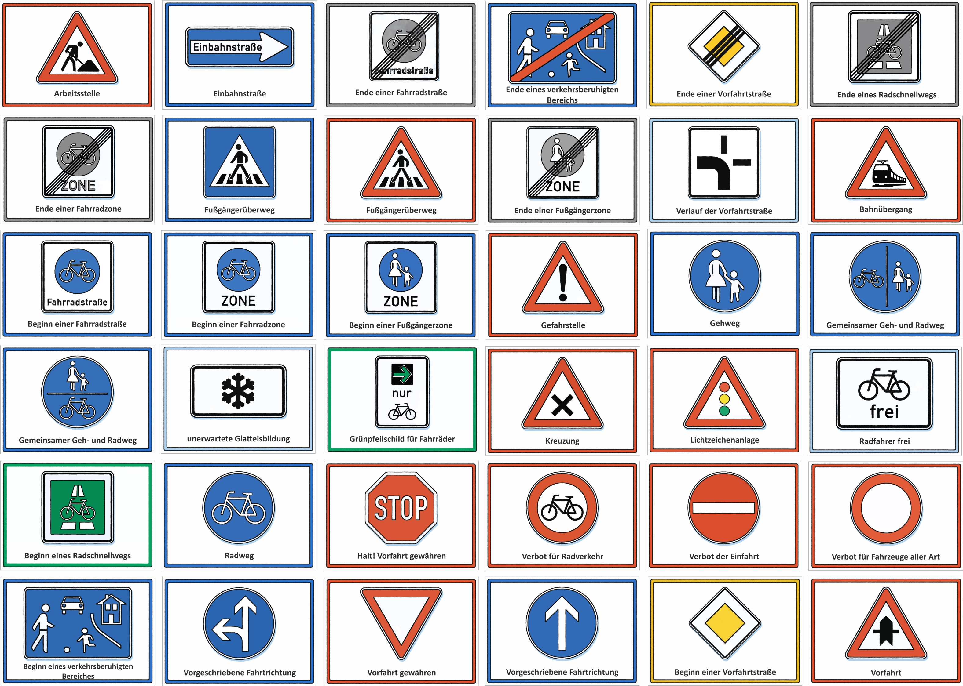 Die Lernkarten der Verkehrszeichen umfassen auch die in der StVO-Novelle 2020 hinzugefügten für Fahrradfahrer wichtigen neuen Schilder.