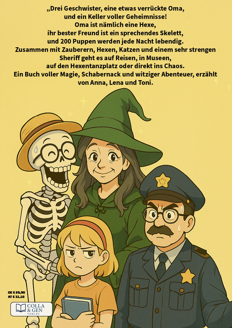 Ein buntes Kinderbuch im Manga-Stil: Oma, die „verrückte Hexe“, sorgt mit Skelett Herbert, 200 Puppen, einem sprechenden Kater und drei neugierigen Enkeln für turbulente Abenteuer zwischen Zauberpannen, fliegenden Teppichen und jeder Menge Humor.