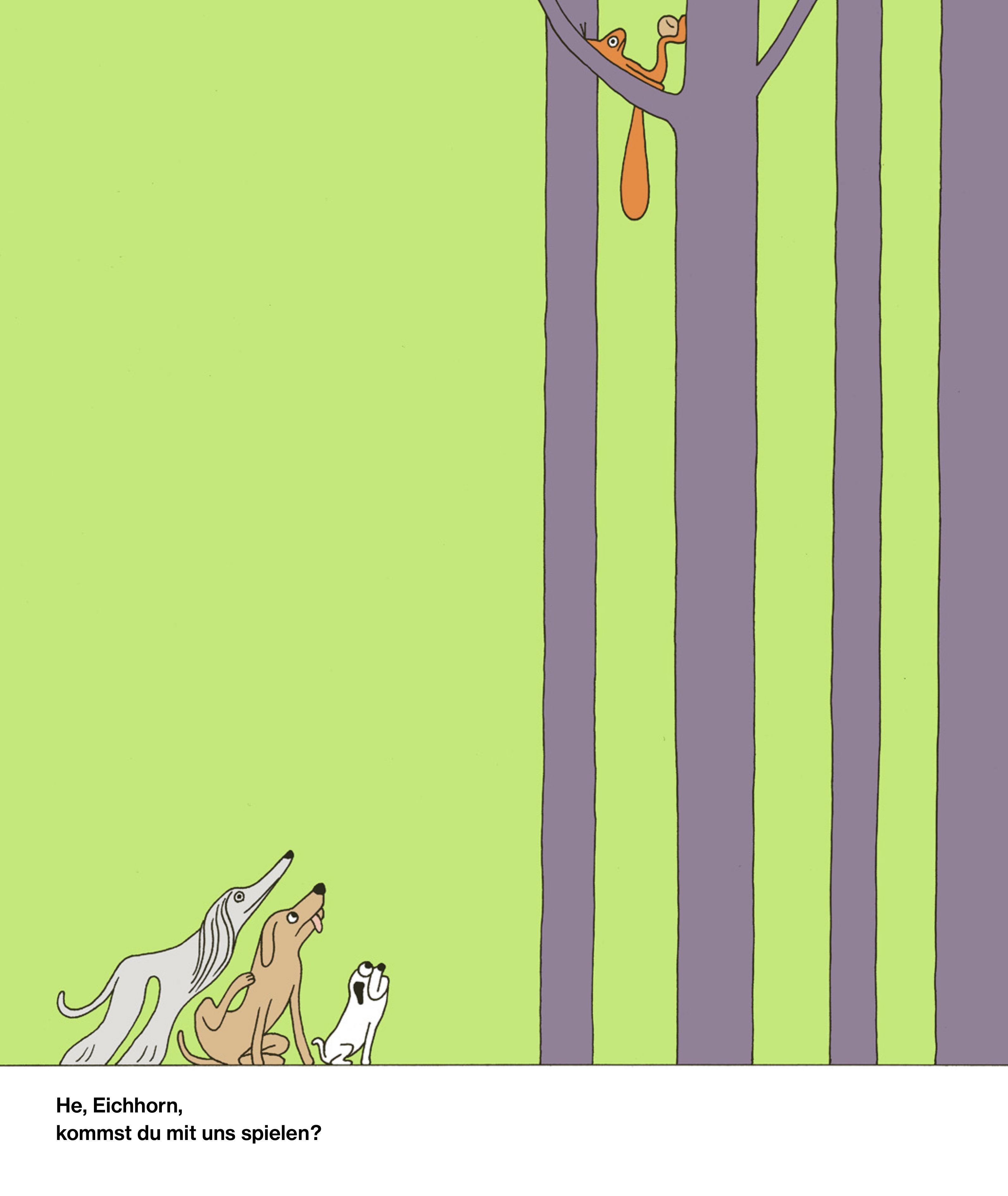 »Entweder du kommst jetzt runter, oder wir kacken unter deinen Baum!« Drei Hunde und ein Eichhorn albern im Wald herum. Es beginnt ein rotzfreches Hin und Her, ein lautes Entweder-oder, mit jedem Umblättern ein Überraschen. Kein Stein bleibt hier auf dem anderen.