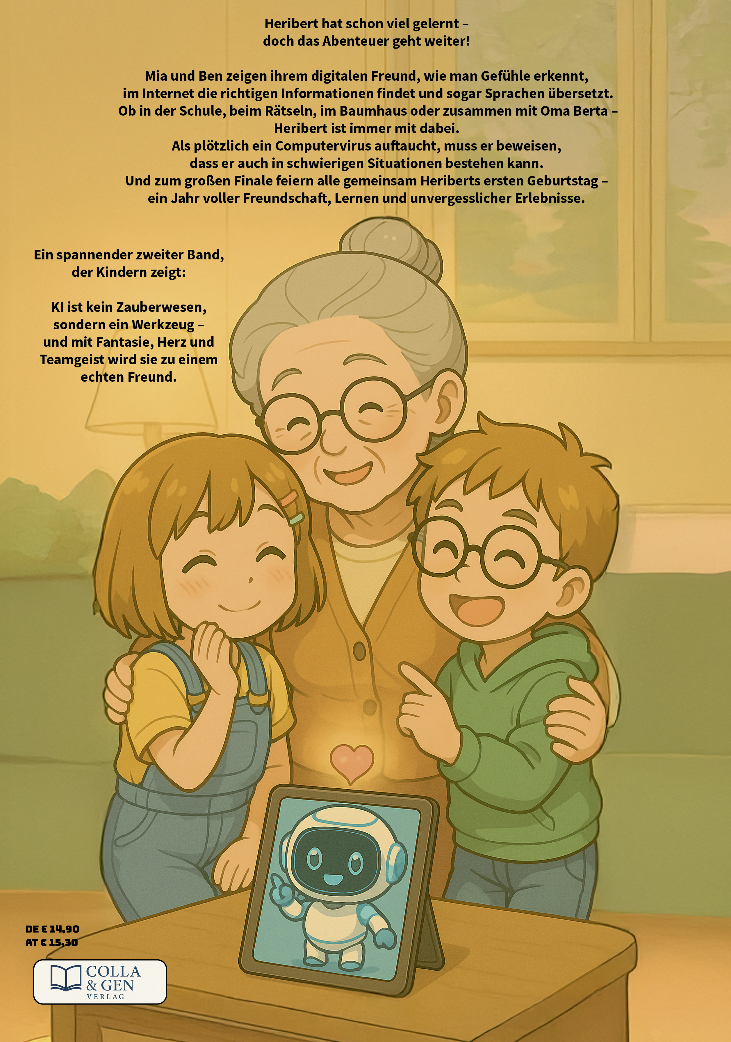 „Ein Jahr mit Heribert – Teil 2: Neue Abenteuer und was wir über KI lernen“ begleitet Mia, Ben und ihren digitalen Freund Heribert durch ein weiteres halbes Jahr voller spannender Geschichten. Dieses farbenfrohe Kinderbuch zeigt, wie KI im Alltag helfen kann – von Sprache und Internet bis hin zu Freundschaft und Gefühlen.