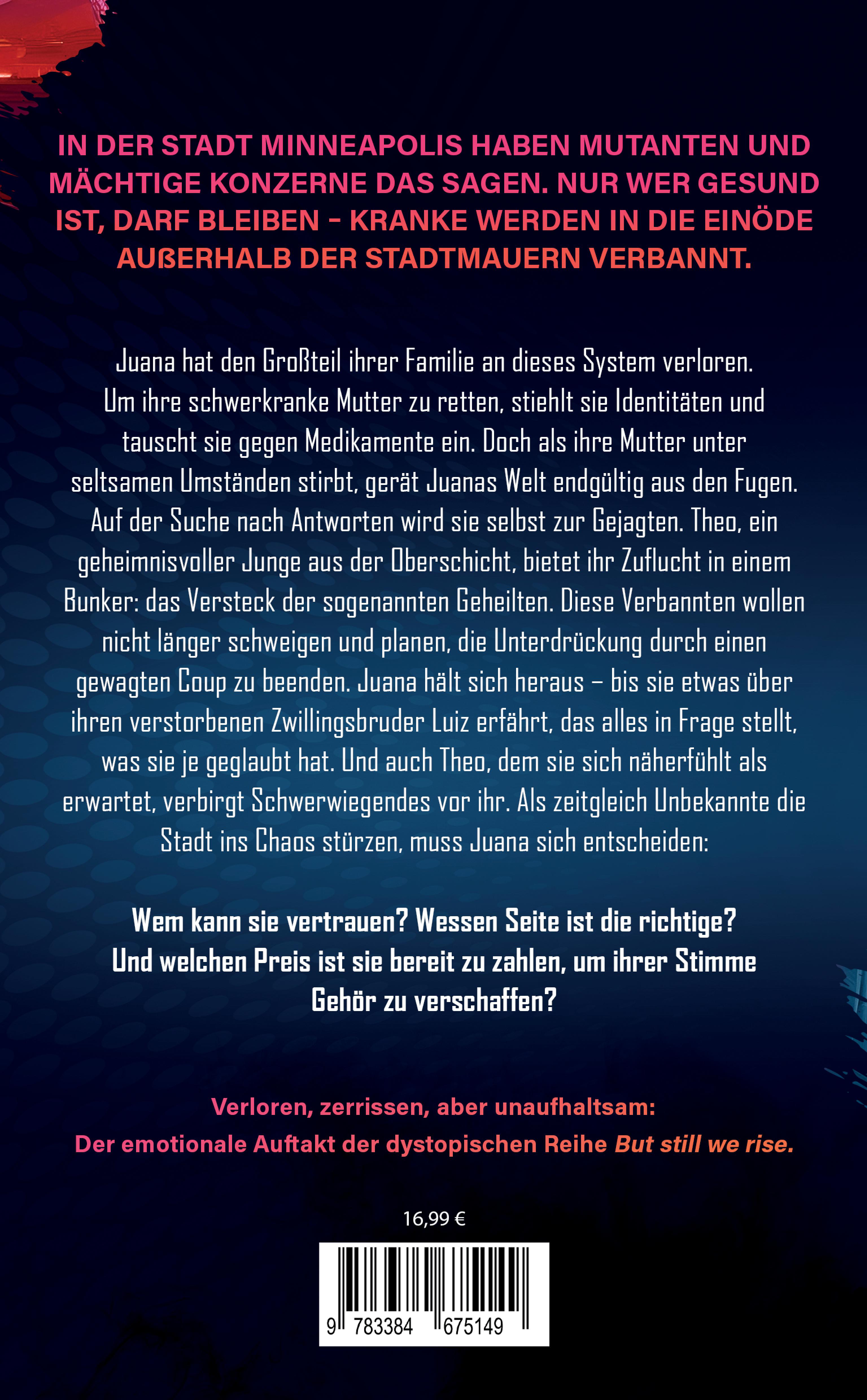 In der Stadt Minneapolis haben Mutanten und mächtige Konzerne das Sagen. Nur wer gesund ist, darf bleiben - Kranke werden in die Einöde außerhalb der Stadtmauern verbannt.Juana hat den Großteil ihrer Familie an dieses System verloren. Um ihre schwerkranke Mutter zu retten, stiehlt sie Identitäten und tauscht sie gegen Medikamente ein. Doch als ihre Mutter unter seltsamen Umständen stirbt, gerät Juanas Welt endgültig aus den Fugen. Auf der Suche nach Antworten wird sie selbst zur Gejagten. Theo, ein geheimnisvoller Junge aus der Oberschicht, bietet ihr Zuflucht in einem Bunker: das Versteck der sogenannten Geheilten. Diese Verbannten wollen nicht länger schweigen und planen, die Unterdrückung durch einen gewagten Coup zu beenden. Juana hält sich heraus - bis sie etwas über ihren verstorbenen Zwillingsbruder Luiz erfährt, das alles in Frage stellt, was sie je geglaubt hat. Und auch Theo, dem sie sich näherfühlt als erwartet, verbirgt Schwerwiegendes vor ihr. Als zeitgleich Unbekannte die Stadt ins Chaos stürzen, muss Juana sich entscheiden: Wem kann sie vertrauen? Wessen Seite ist die richtige? Und welchen Preis ist sie bereit zu zahlen, um ihrer Stimme Gehör zu verschaffen?Spannend, düster, emotional: BANISHED BUT LOUD ist der packende Auftakt der dystopischen Young-Adult-Reihe But still we rise - und überzeugt mit seiner Mischung aus Action, Gesellschaftskritik und Menschlichkeit. Für Fans von Franzi Kopka ("Honesty" & "Gameshow"), Suzanne Collins ("Hunger Games"), Ursula Poznanski ("Die Verratenen") und Veronica Roth ("Divergent"). Empfohlen für Lesende ab 14 Jahren.
