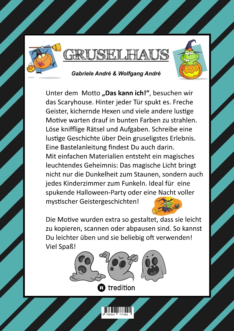 | Schlagworte | Bastelanleitung • Craftbook • Familie • Friedhof • Geister • GEISTERNACHT • Gespenster • Gruselhaus • Gruseln • Halloween • HALLOWEEN-KOSTÜM • Halloween-Party • Hexen • Hexenhaus • Ideenfindung • Kinder • knifflige Aufgaben • Laternen • Lernförderung • Lesen • Lieder • lösen • lustige Motive • MAGISCHE LICHTER • magisches Licht • Malen • Monster • Mumien • MUNSTERHOUSE • Musik • Rätsel • Rechnen • SCARYHOUSE • Schabernack • Schrecken • Schreiben • Schüler • Song • Storytelling • Totenkopf • Training • tutorials • Zauberbuch • Zauberei • Zauberer • Zeichnen |
