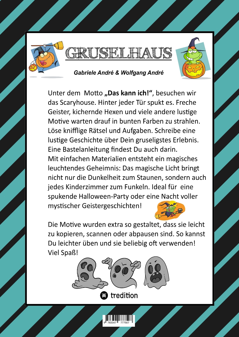 | Schlagworte | Bastelanleitung • Craftbook • Familie • Friedhof • Geister • GEISTERNACHT • Gespenster • Gruselhaus • Gruseln • Halloween • HALLOWEEN-KOSTÜM • Halloween-Party • Hexen • Hexenhaus • Ideenfindung • Kinder • knifflige Aufgaben • Laternen • Lernförderung • Lesen • Lieder • lösen • lustige Motive • MAGISCHE LICHTER • magisches Licht • Malen • Monster • Mumien • MUNSTERHOUSE • Musik • Rätsel • Rechnen • SCARYHOUSE • Schabernack • Schrecken • Schreiben • Schüler • Song • Storytelling • Totenkopf • Training • tutorials • Zauberbuch • Zauberei • Zauberer • Zeichnen |