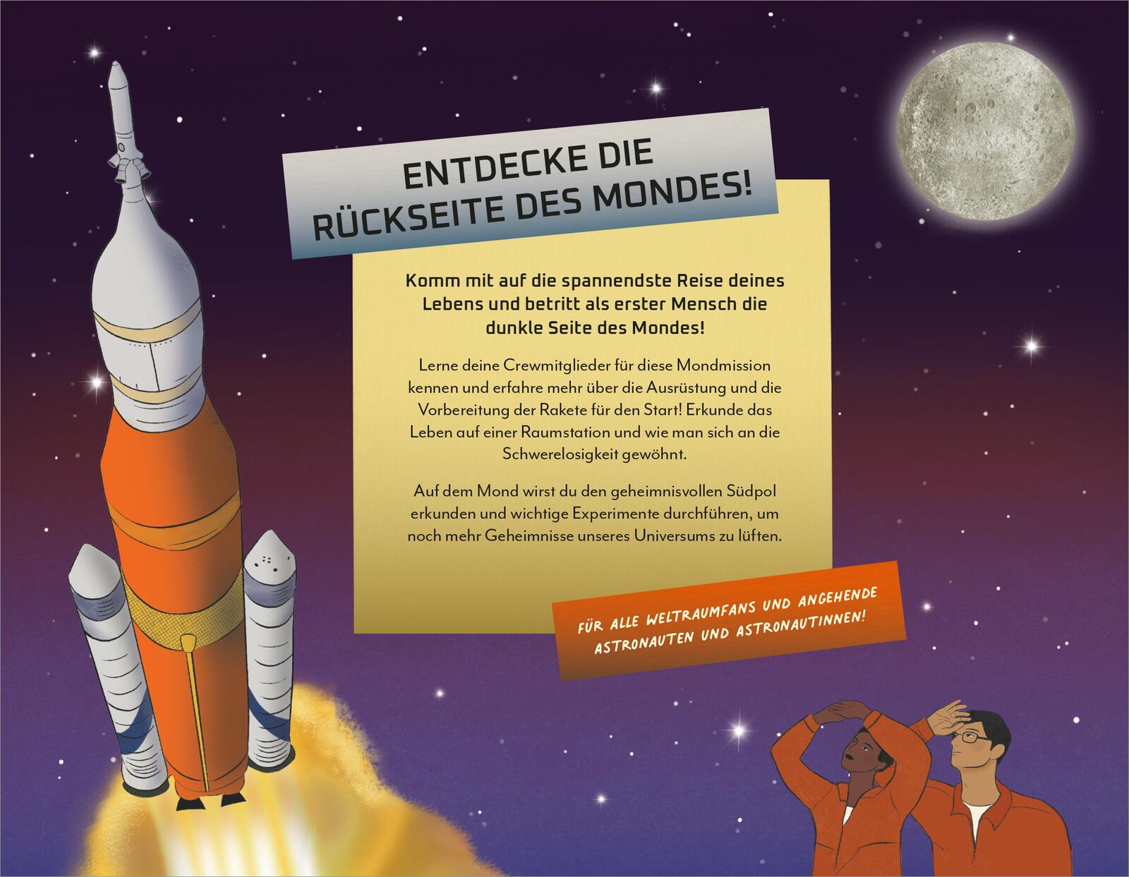 In diesem Kindersachbuch gehen alle Weltraumfans ab 8 Jahren auf eine Mondmission, um die Rückseite des Mondes zu erforschen. Das Weltraumabenteuer wird perfekt vorbereitet und erklärt, sei es zum Thema Ausrüstung, Leben an Bord des Raumfahrzeugs, Leben in der Schwerelosigkeit oder Mondlandung und Mondspaziergang. Mit vielen Bildern, kindgerechten Texten und aktiver Ansprache an die Leser und Leserinnen, die sich mitgenommen fühlen auf die spannende Monderkundung.