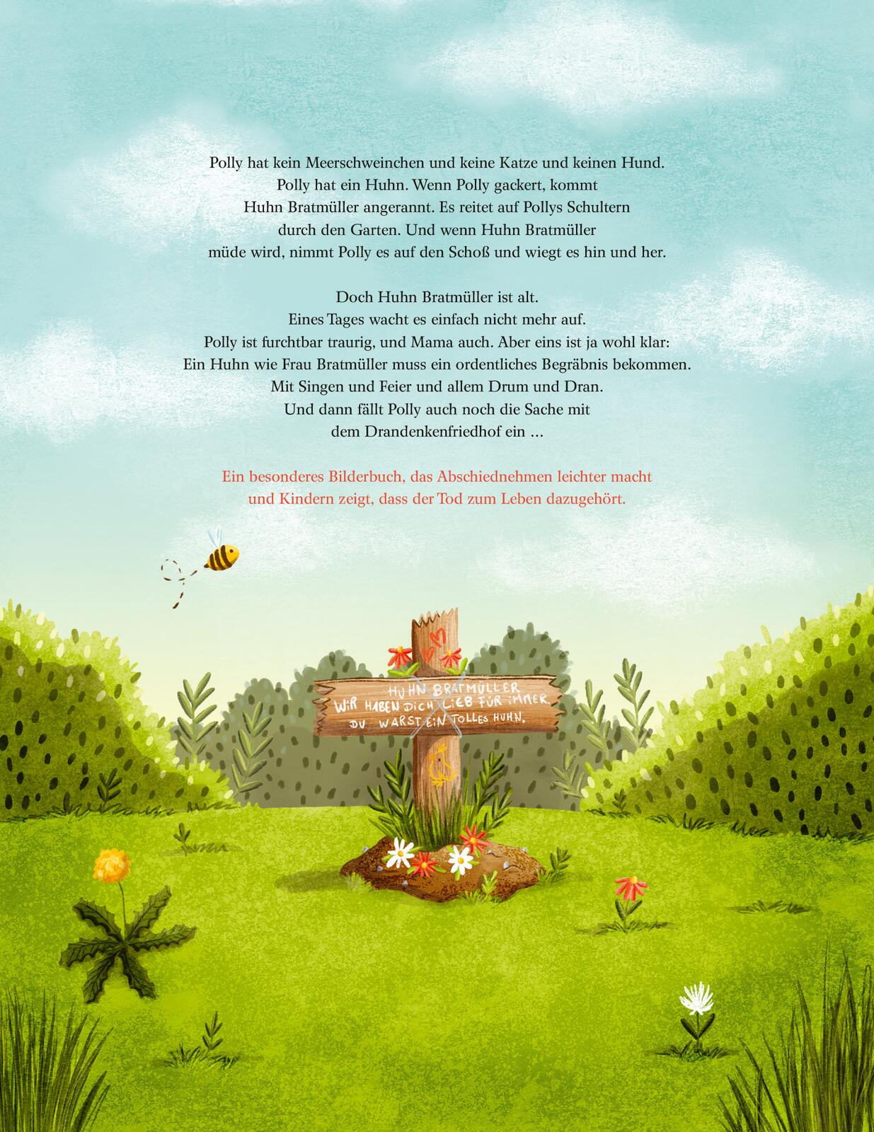 Polly hat kein Meerschweinchen und keine Katze und keinen Hund. Polly hat ein Huhn. Wenn Polly gackert, kommt Huhn Bratmüller angerannt, ganz egal, wo es gerade Würmer sucht. Es reitet auf Pollys Schultern durch den Garten, und wenn Huhn Bratmüller müde wird, nimmt Polly es auf den Schoß und wiegt es hin und her. Doch plötzlich geht es Huhn Bratmüller nicht mehr gut. Es ist sehr müde und dann wacht es eines Tages nicht mehr auf. Polly ist furchtbar traurig und weint dicke Tränen in Mamas Kuschelpullover. Und dann beschließt sie, einen Drandenken-Friedhof zu errichten, direkt im Garten. Da können alle Tiere ein Grab bekommen. Egal ob verkaufte Schweine, kleine Kaninchen oder ausgeflogene Kanarienvögel. Polly findet für jedes Tier ein passendes Plätzchen zum Erinnern und für die letzte Ruhe. Und Polly ist sicher, ihr Huhn Bratmüller ist im Himmel das allerschnellste Huhn. Schließlich hat es ja Doppelflügel.