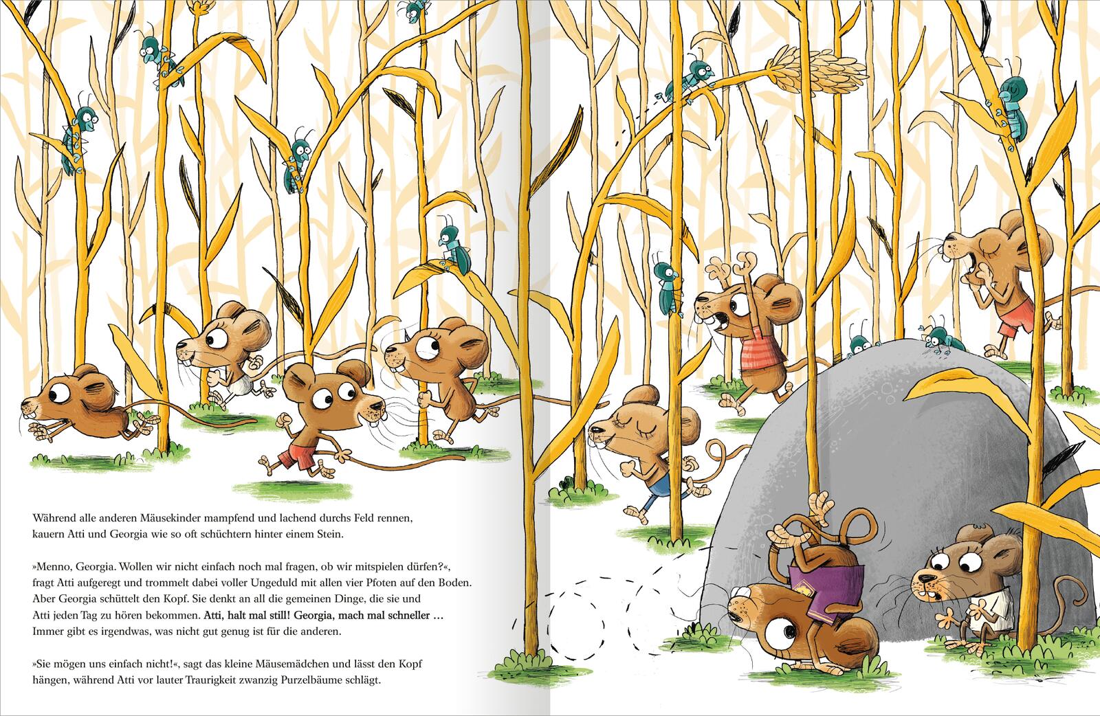 Auf einem goldenen Feld leben die zwei ungleichen Mäuseschwestern Georgia und Atti. Während Georgia schüchtern und unsicher ist, sprudelt Atti nur so vor Energie - doch beide fühlen sich nicht wirklich akzeptiert. Gemeinsam wagen sie ein nächtliches Abenteuer, das alles verändert: Sie lernen von einem trampelnden Pony, einer schimmernden Motte, einer eleganten Eule und einem mutigen Igel, dass man genau richtig ist, so wie man ist. Ein liebevoll erzähltes Bilderbuch über Selbstakzeptanz, Mut und die Kraft der Geschwisterliebe.