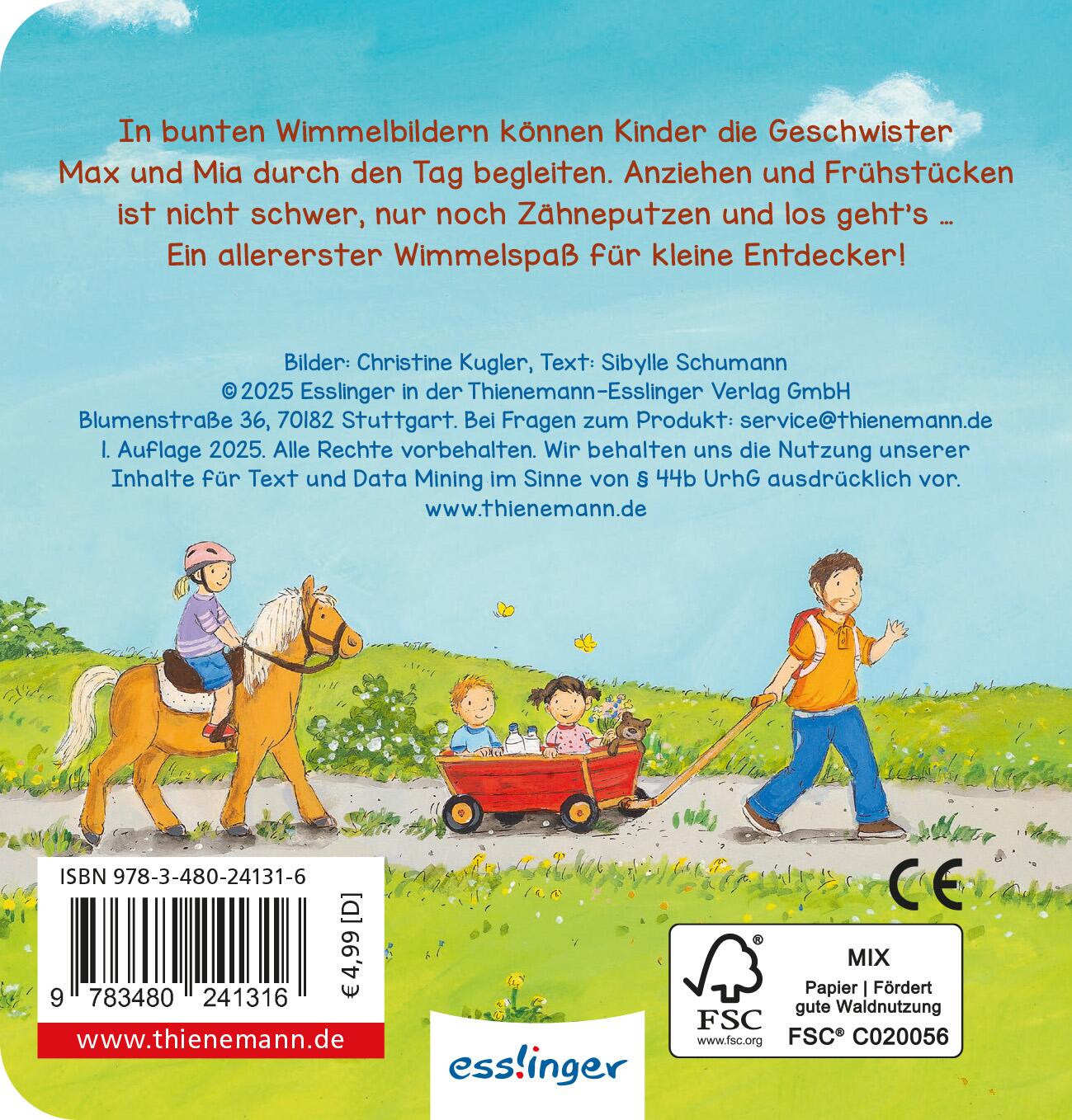 Mit den Geschwistern Max und Mia erleben kleine Entdecker:innen einen bunten Tag voller Abenteuer: Vom Anziehen am Morgen über das Zähneputzen, den Weg in die Kita, das gemeinsame Mittagessen bis hin zum Einkaufen und Abendessen - auf jeder Seite gibt es liebevoll gestaltete Wimmelbilder und einfache Suchaufgaben zu entdecken. So wird der Alltag zum spannenden Erlebnis und das Mini-Wimmelbuch zum perfekten Begleiter für zu Hause oder unterwegs.