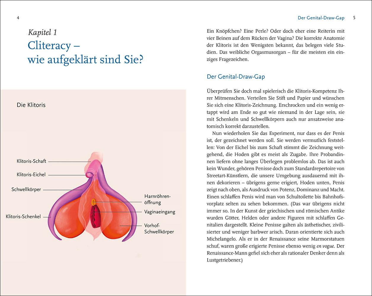 Wüssten Sie, wie man eine Klitoris zeichnet? Wenn nicht - Sie sind nicht allein. Über das weibliche Lustorgan ist viel zu wenig bekannt. Doch im 19. Jahrhundert wusste man es noch: Die Klitoris ist mindestens so groß wie der Penis beziehungsweise der durchschnittliche Penis sogar etwas kleiner als die Klitoris. Sie hat eine äußerlich sichtbare Eichel - und darüber hinaus vier mit Schwellkörpern gefüllte Schenkel. Danach wurde das Wissen um das potente weibliche Orgasmusorgan über Jahrzehnte ignoriert, mit weitreichenden Folgen für die Wahrnehmung weiblicher Lust. Doch Frauen wollen nicht weniger Sex als Männer, sie wollen oft nur nicht den, der ihnen geboten wird. Nicht Penis und Vagina sind einander entsprechende Organe, wie unsere auf Penetration fixierte Kultur uns glauben macht, sondern Penis und Klitoris: Sie entstehen aus denselben embryonalen Anlagen.