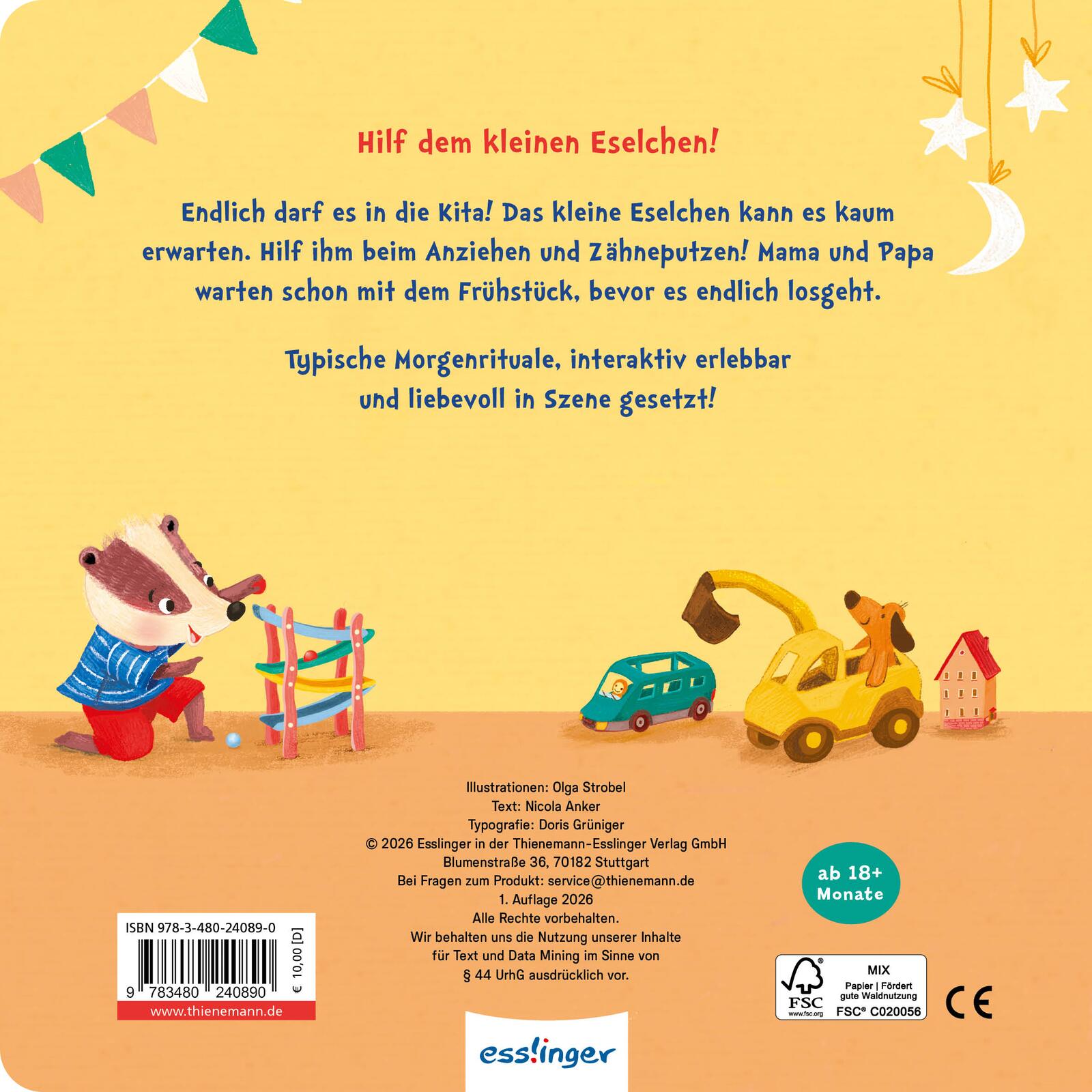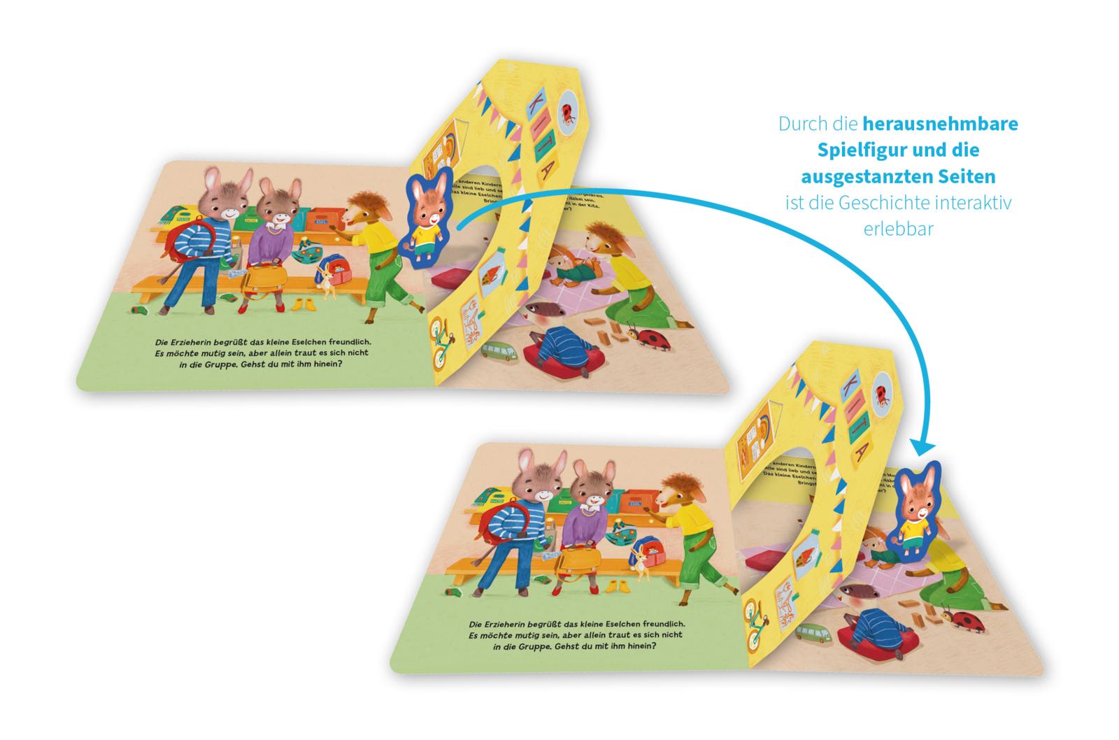 Endlich Kitakind! Der kleine Esel kann es kaum erwarten. Klar, dass Mama und Papa ihn an seinem großen Tag begleiten. Auch die Allerkleinsten ab 18 Monaten helfen mit. Sie bringen ihn ins Bad, zum Anziehen und Frühstücken. Und sie dürfen für den kleinen Esel mutig sein, wenn er sich doch noch nicht allein in den Morgenkreis traut.