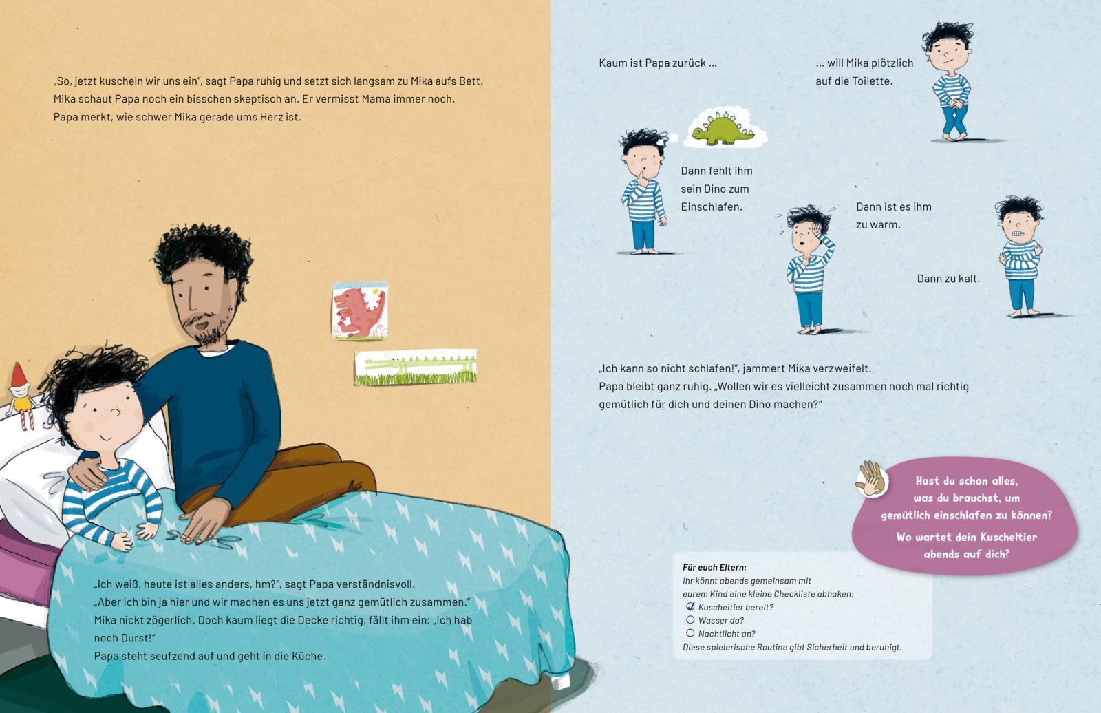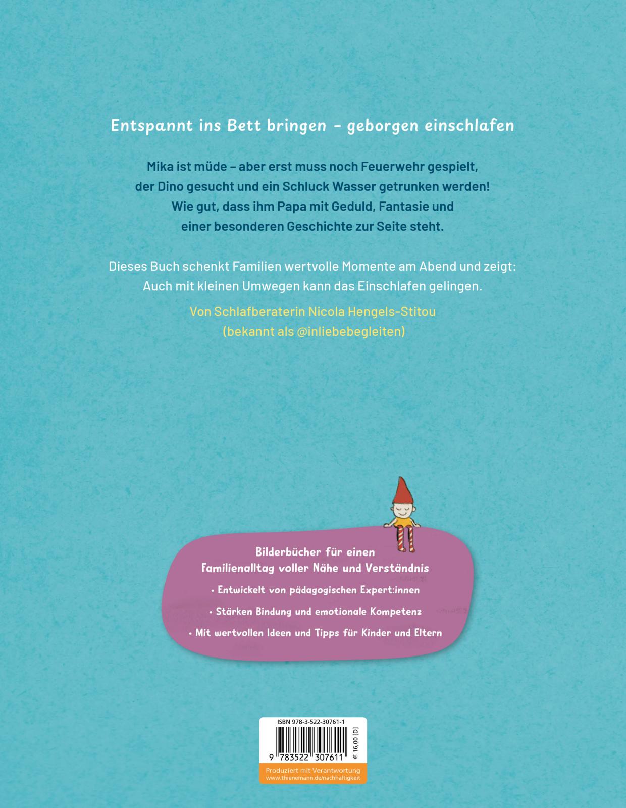Mika ist müde - aber vor dem Schlafengehen gibt es noch so viel zu tun: Feuerwehr spielen, etwas trinken, den Dino suchen ... und wo bleibt eigentlich Mama? Dieses Bilderbuch nimmt Kinder ab 3 Jahren und ihre Eltern mit auf eine emotionale Reise durch die Herausforderungen der abendlichen Einschlafbegleitung. Mit viel Verständnis für die Bedürfnisse kleiner Nachteulen zeigt die Geschichte, wie liebevolle Rituale, Geduld und Nähe helfen, den Tag ruhig ausklingen zu lassen - auch wenn nicht immer alles nach Plan läuft. Die einfühlsamen Dialoge und die atmosphärischen Bilder laden zum gemeinsamen Nachspüren, Erzählen und Kuscheln ein. Eltern finden auf jeder Seite wertvolle Impulse und praktische Schlaftipps, die den Familienalltag erleichtern und für mehr Gelassenheit sorgen.