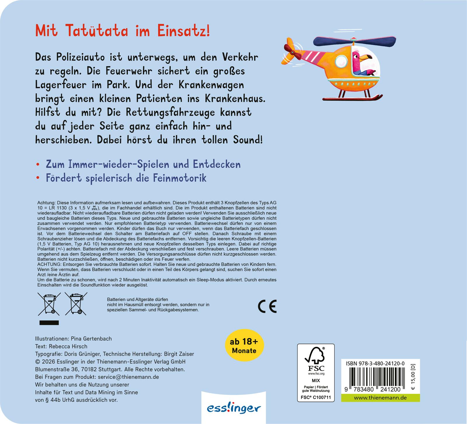 Mit Tatütata im Einsatz! Das Polizeiauto ist unterwegs, um den Verkehr zu regeln. Die Feuerwehr sichert ein großes Lagerfeuer im Park. Der Abschleppwagen eilt zur Unfallstelle. Und der Krankenwagen bringt einen kleinen Patienten ins Krankenhaus.