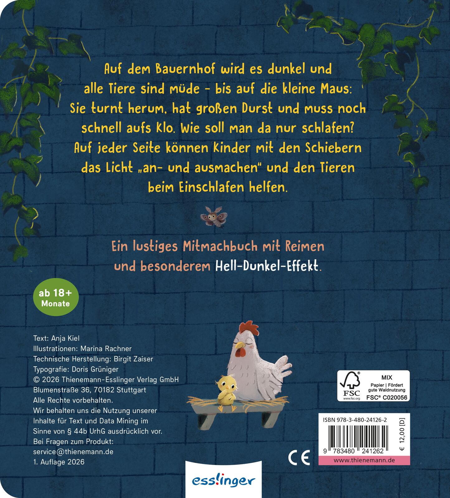 Wenn auf dem Bauernhof langsam die Sonne untergeht, wird es Zeit zum Schlafen - doch eine kleine Maus ist noch hellwach! Sie turnt, hat Durst oder muss noch schnell aufs Klo. Seite für Seite können Kinder mit den Schiebe-Elementen das Licht an- und ausmachen und den Tieren beim Einschlafen helfen. Die lustigen Reime und die stimmungsvollen Illustrationen machen dieses Mitmachbuch zu einer wertvollen Einschlafhilfe und zu einem Lieblingsbuch für die abendlichen Einschlaf-Rituale.