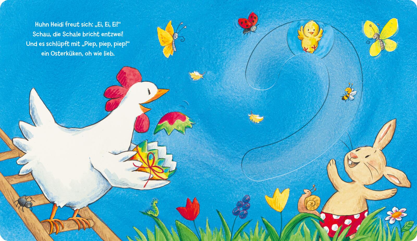 Huch, was kullert da dem kleinen Osterhasen Henri vor die Pforten? Ein wunderschönes weißes Ei! Gewaschen, poliert und kunterbunt bemalt, versteckt er es bei Huhn Heidi im Nest. Was für eine wunderbare Oster-Überraschung, als daraus ein zuckersüßes flauschiges Küken schlüpft!