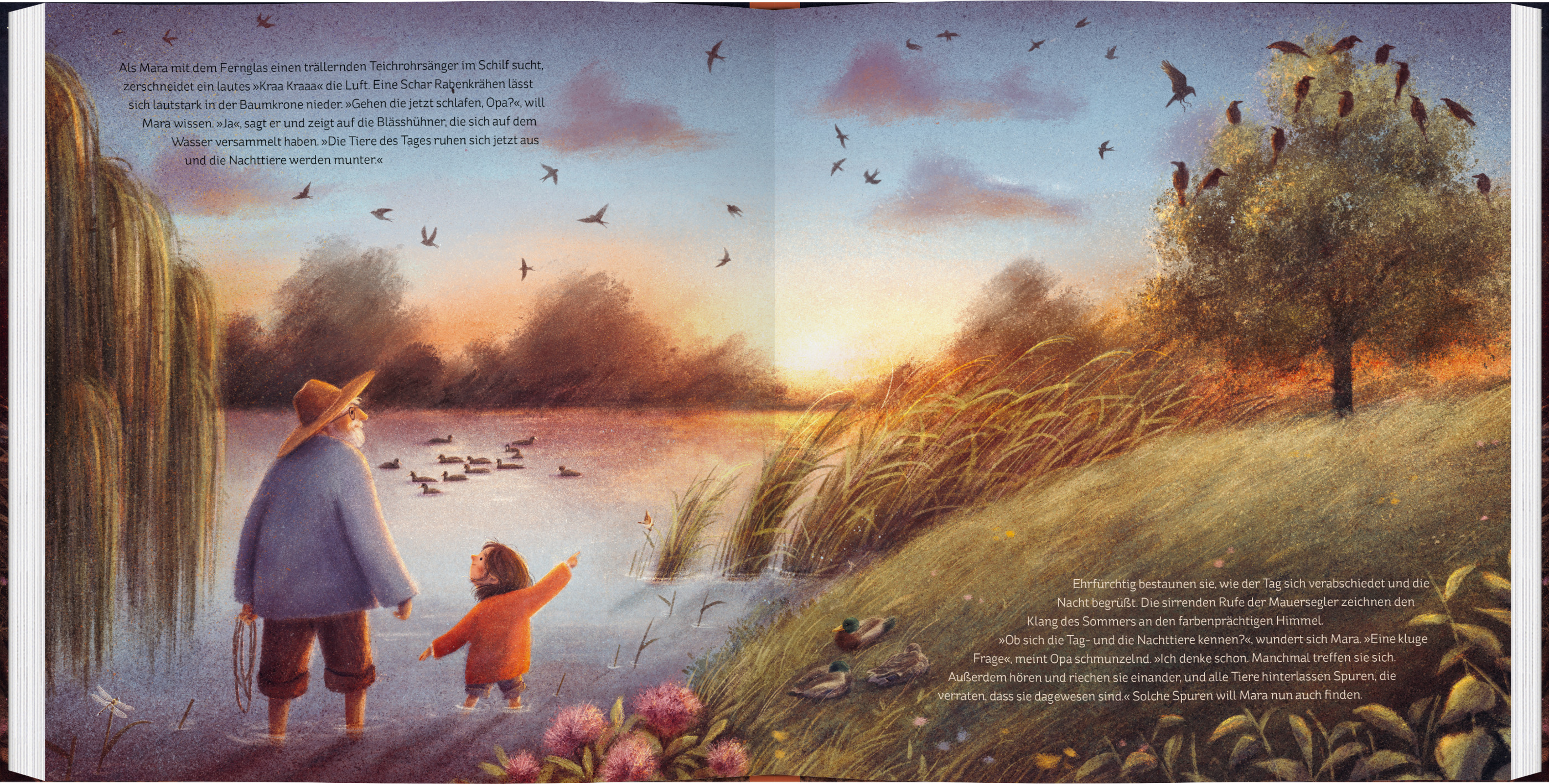 Dieses liebevoll erzählte und atmosphärisch gezeichnete Sachbilderbuch erzählt von einer Nacht im Zelt draußen am Teich. Mara und ihr Opa entdecken, wie viele Tiere nachts unterwegs sind …