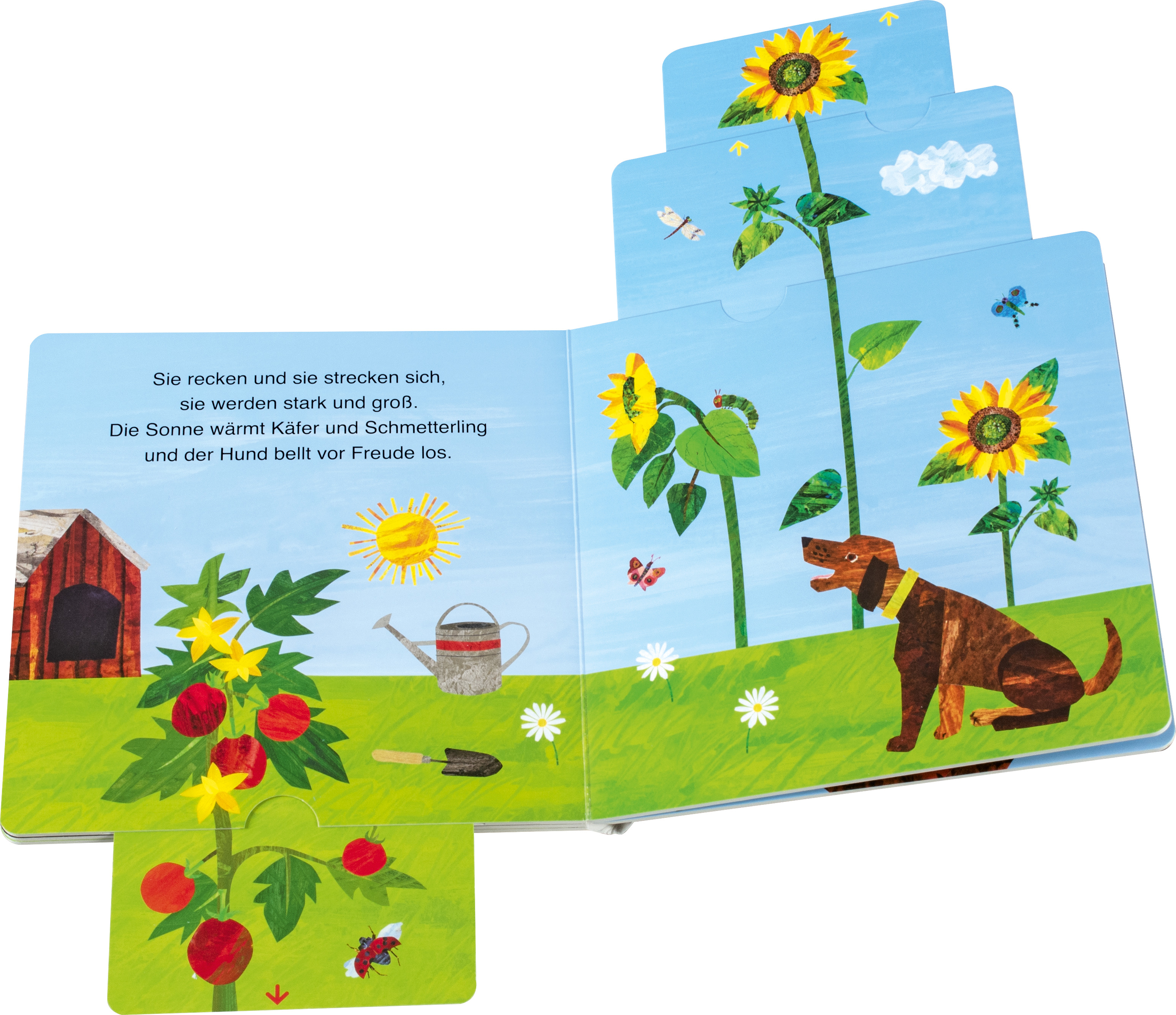 Die kleine Raupe Nimmersatt zeigt uns in diesem schön ausgestatteten, mit Dreh- und Schiebeelementen versehenen Pappbilderbuch, wie schön es im Garten ist.