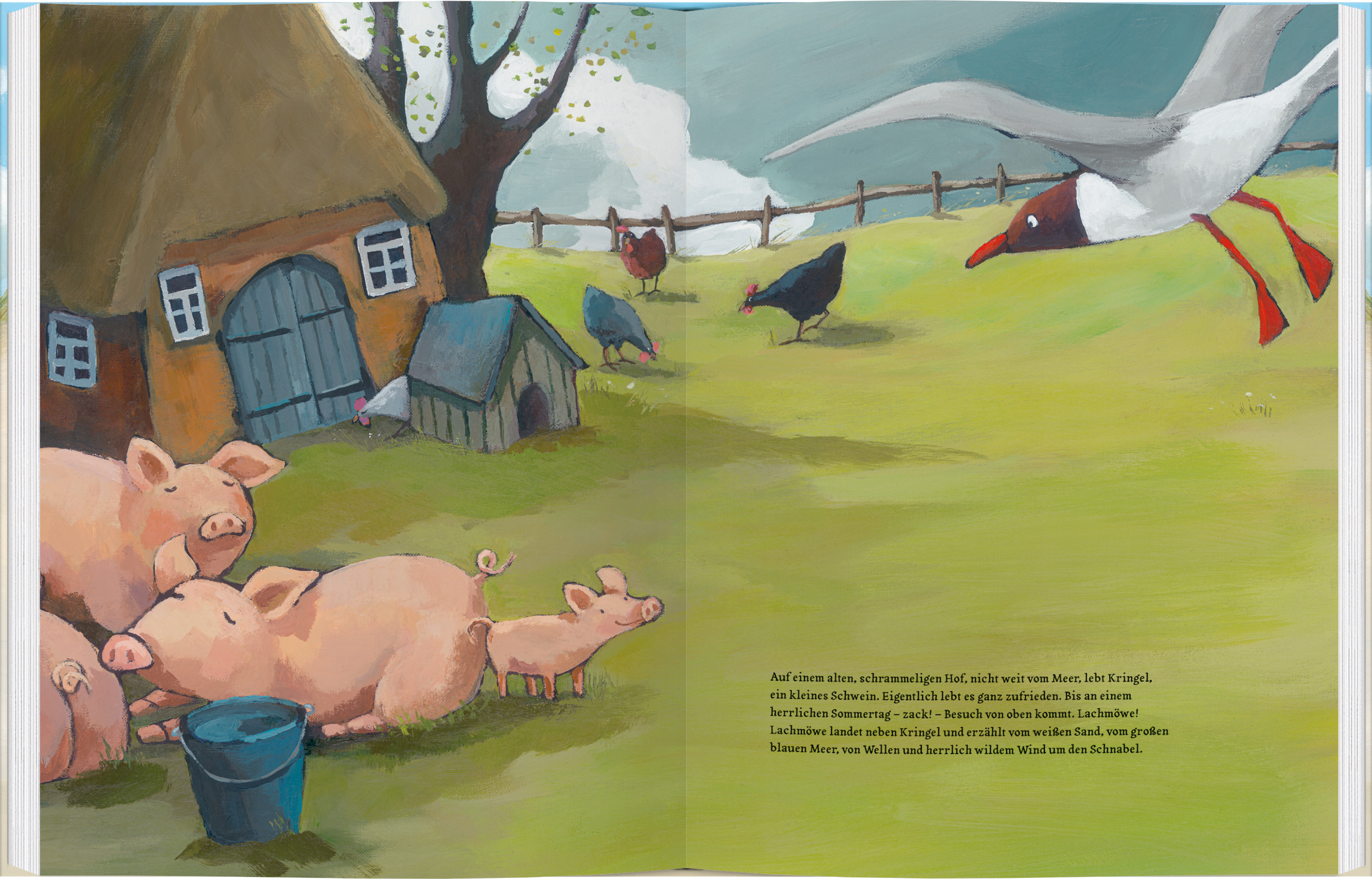 Auf einem alten Hof lebt Kringel. Das kleine Schwein hat einen großen Traum seit Lachmöwe ihm vom weiten blauen Meer und dem Strand erzählt hat. Einmal ans Meer! Die anderen Hoftiere halten nichts von solchen Flausen. Aber Kringel nutzt seine Chance und trippelt zuversichtlich los. Manchmal fühlt es sich zu klein für ein so großes Abenteuer, aber als es endlich den warmen Sand unter den Hufen spürt und die Wellen vor ihm in der Sonne glitzern, ist es das glücklichste Schweinchen, das man sich denken kann.Henrike Wilson gelingt es in ihren großflächigen Bilderbuchseiten, das Licht der Küste leuchten zu lassen. Eine Glücks- und Freundschaftsgeschichte über den Mut, seiner Sehnsucht zu folgen.