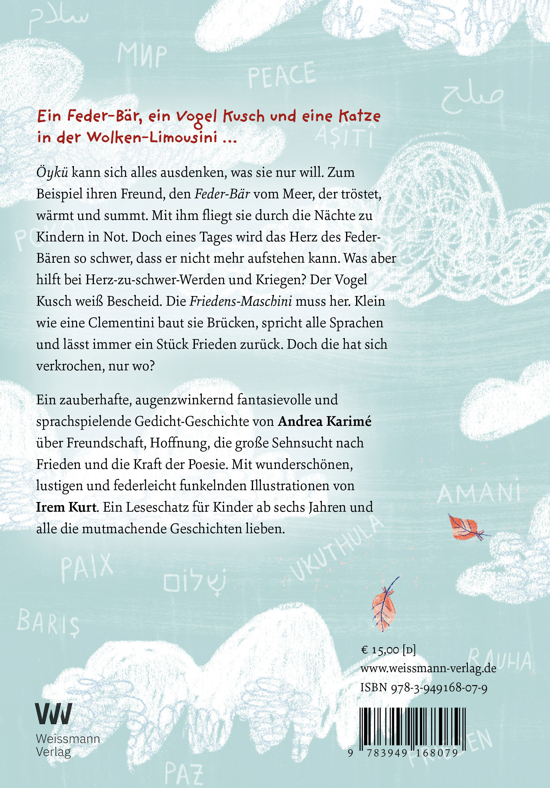 Öykü kann sich alles ausdenken, was sie nur will. Zum Beispiel ihren Freund, den Feder-Bär vom Meer, der tröstet, wärmt und summt. Mit ihm fliegt sie durch die Nächte zu Kindern in Not. Doch eines Tages wird das Herz des Feder-Bären so schwer, dass er nicht mehr aufstehen kann. Was aber hilft bei Herz-zu-schwer-Werden und Kriegen? Der Vogel Kusch weiß Bescheid. Die Friedens-Maschini muss her. Klein wie eine Clementini baut sie Brücken, spricht alle Sprachen und lässt immer ein Stück Frieden zurück. Doch die hat sich verkrochen, nur wo?