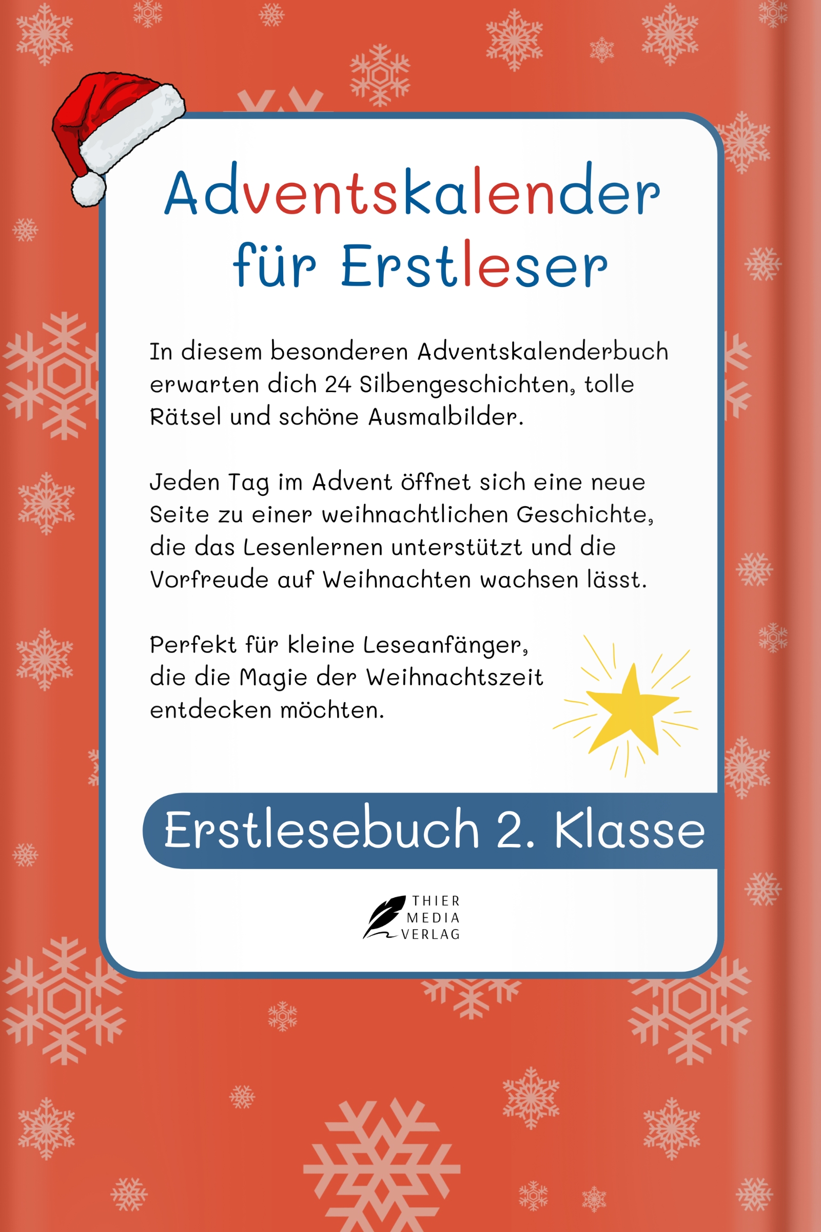 Weihnachtlicher Lesespaß für Kinder ab 7 Jahren - 24 Silbengeschichten für die AdventszeitDieses liebevoll gestaltete Adventskalenderbuch begleitet Kinder Tag für Tag durch den Dezember und macht das Lesenlernen zu einem festlichen Erlebnis. Mit 24 kurzen, kindgerechten Geschichten in bunter Silbenschrift erleben kleine Leserinnen und Leser täglich neue Abenteuer rund um Winter, Schule und Weihnachten.Die farbige Silbenmarkierung erleichtert das Lesen, stärkt das Textverständnis und sorgt für schnelle Erfolgserlebnisse. Dank großer Schrift, klarer Struktur und einfacher Sätze bleibt das Buch übersichtlich und motivierend - ideal für Kinder der 2. Klasse.Jede Geschichte ist bunt illustriert und vermittelt eine fröhlich-weihnachtliche Stimmung. Zusätzlich sorgen Rätsel und Ausmalbilder für spielerische Abwechslung und fördern Konzentration sowie Kreativität.Ob als tägliches Adventsritual, Geschenk oder Alternative zum Schokoladenkalender - dieses pädagogisch wertvolle Lesebuch schenkt Kindern Freude, Lesemotivation und Vorfreude auf Weihnachten.