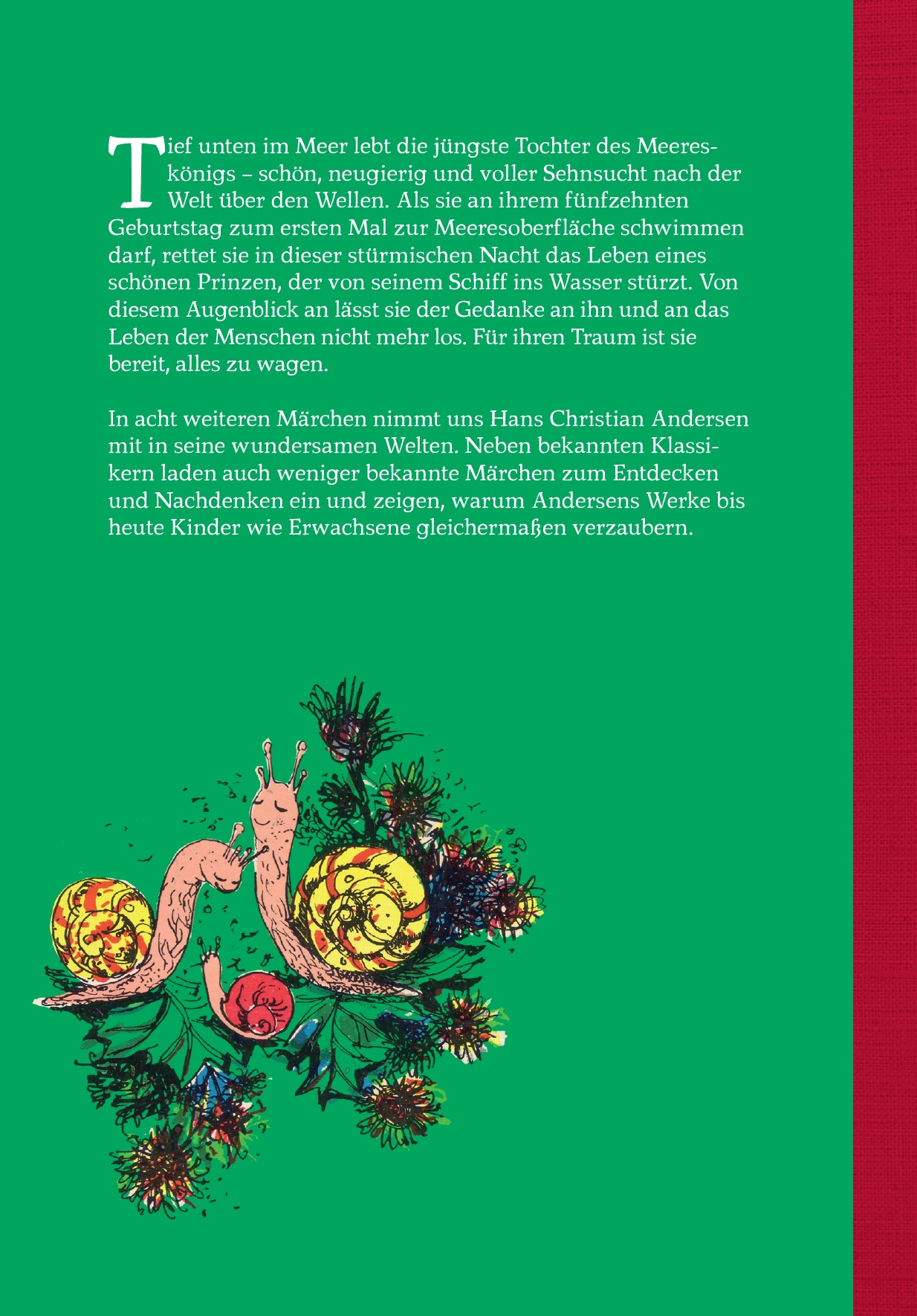 Tief unten im Meer lebt die jüngste Tochter des Meereskönigs - schön, neugierig und voller Sehnsucht nach der Welt über den Wellen. Als sie an ihrem fünfzehnten Geburtstag zum ersten Mal zur Meeresoberfläche schwimmen darf, rettet sie in dieser stürmischen Nacht das Leben eines schönen Prinzen, der von seinem Schiff ins Wasser stürzt. Von diesem Augenblick an lässt sie der Gedanke an ihn und an das Leben der Menschen nicht mehr los. Für ihren Traum ist sie bereit, alles zu wagen. In acht weiteren Märchen nimmt uns Hans Christian Andersen mit in seine wundersamen Welten. Neben bekannten Klassikern laden auch weniger bekannte Märchen zum Entdecken und Nachdenken ein und zeigen, warum Andersens Werke bis heute Kinder wie Erwachsene gleichermaßen verzaubern.