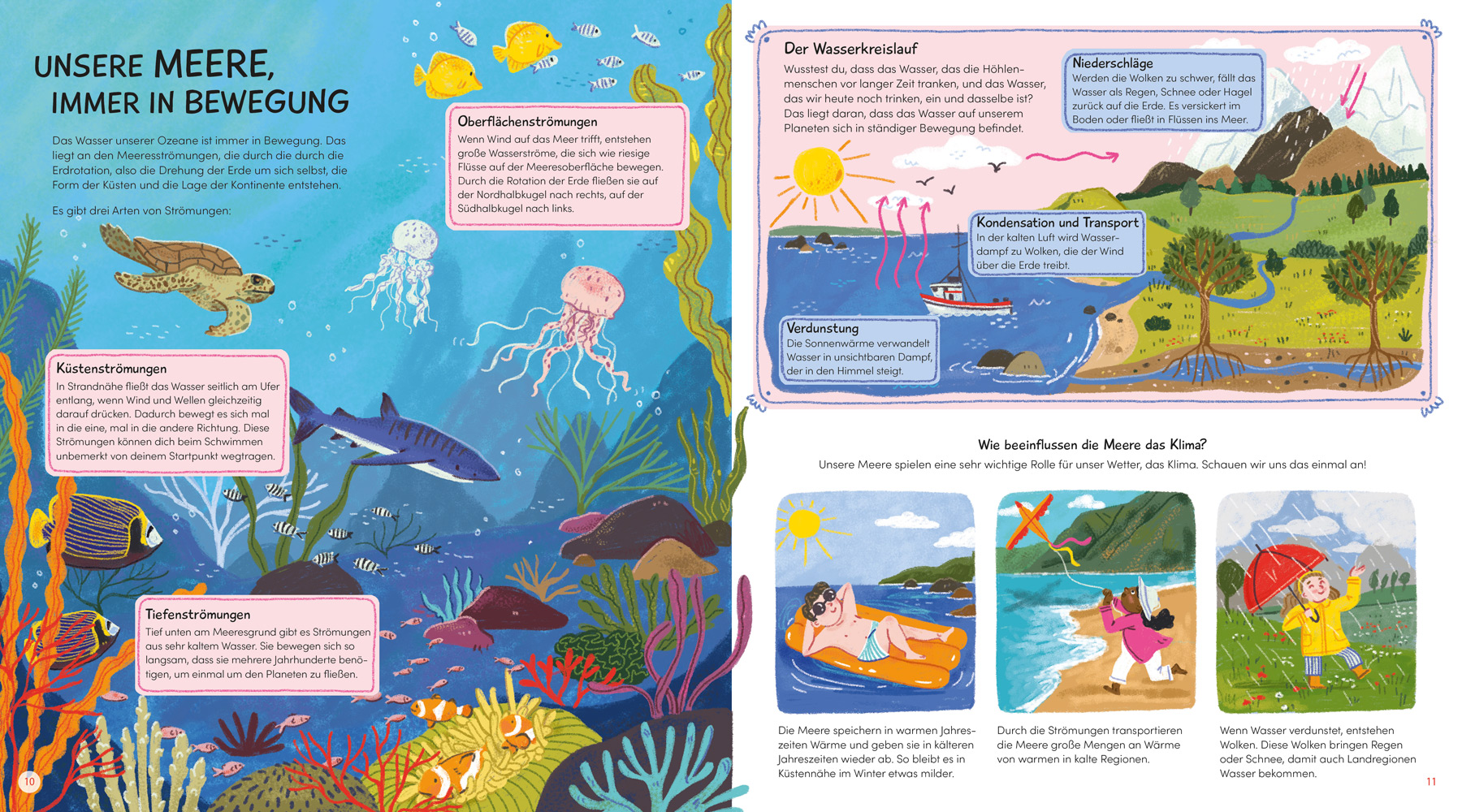 Unsere Ozeane sind ein riesiges Abenteuerland voller Geheimnisse. Tief unten im Meer tummeln sich Haie und Wale, näher an der Küste findest du Krebse, Muscheln und bunte Fische. Wusstest du, dass Korallenriffe wie kleine Städte für unzählige Tiere sind? Oder, dass manche Quallen im Dunkeln leuchten? Und vielleicht hast du schon einmal Muscheln gesammelt oder eine Flaschenpost entdeckt? In diesem kunterbunten Buch erfährst du jede Menge Spannendes über das Meer - und kannst gleich selbst kreativ werden und mitmachen!
