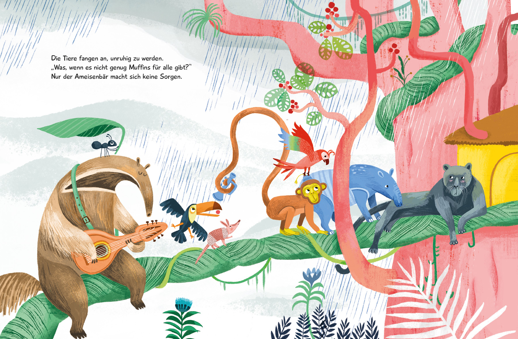 Im Regenwald geht die Sonne auf und es breitet sich ein köstlicher Duft von frisch gebackenen Muffins aus, die das Faultier für seine Nachbarn gebacken hat. Der Ameisenbär, der die Muffins unbedingt als Erster probieren will, ist extra früh aufgestanden und stellt sich in die Warteschlange. Doch schon bald kommen andere ungeduldige Tiere dazu, die auch einen Muffin haben wollen. Da ist Chaos vorprogrammiert! Wird der Ameisenbär seinen heiß begehrten Muffin bekommen?