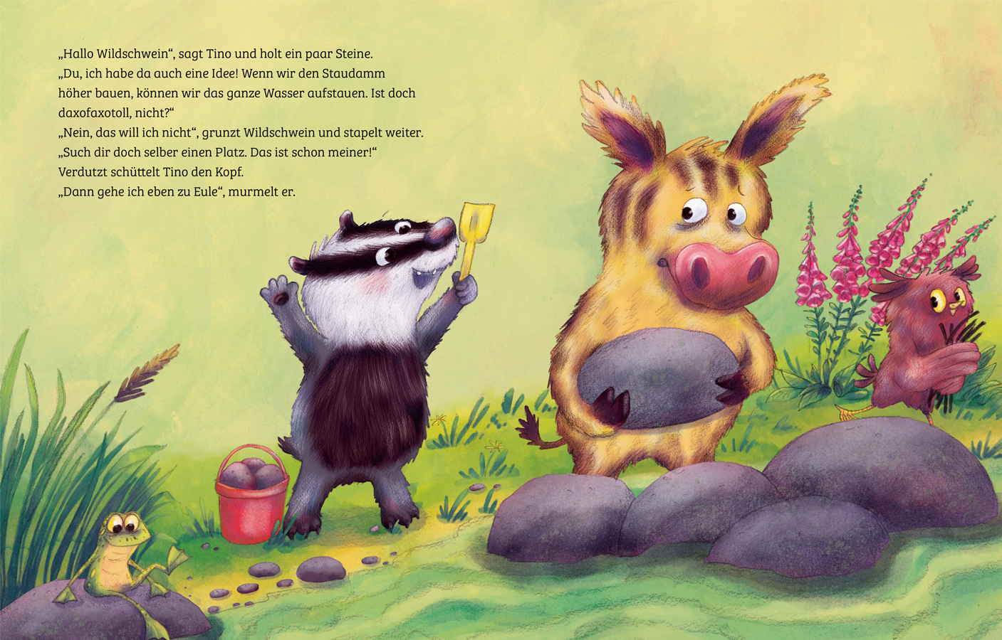 Endlich hat es aufgehört zu regnen. Schnurstracks macht sich der kleine Dachs mit seinem Opa auf den Weg zum Waldspielplatz. Wo sonst lässt es sich besser mit Pfützenwasser spielen und in der Erde graben? Dort angekommen sind seine Freunde, Fuchs, Wildschwein und Eule, bereits in ihr eigenes Spiel vertieft - jeder für sich. Dabei hätte der kleine Dachs so gute Ideen. Seine Freunde wollen aber lieber alleine spielen. Doch dann hat er eine Idee - und beginnt einfach selbst zu bauen, bis daraus mehr entsteht als geahnt.