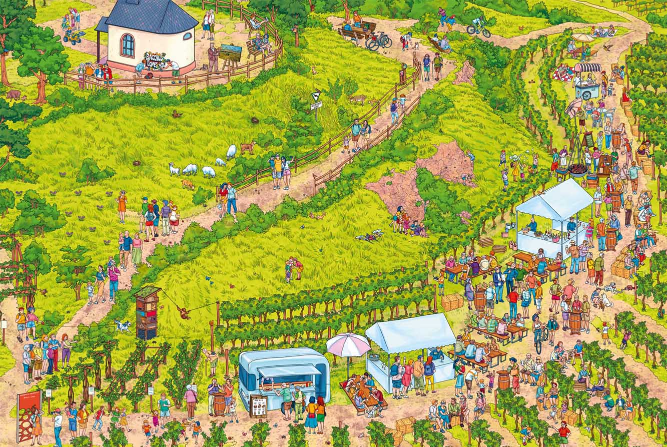 Ein Wimmelbuch für alle Generationen. Entdecke 8 weitere Wimmelbilder in Band 2. Liebevolle Alltagsgeschichten, die Schönheiten der Region und pure Pfälzer Lebensfreude – zum Entdecken, Lachen, Staunen und Verweilen.