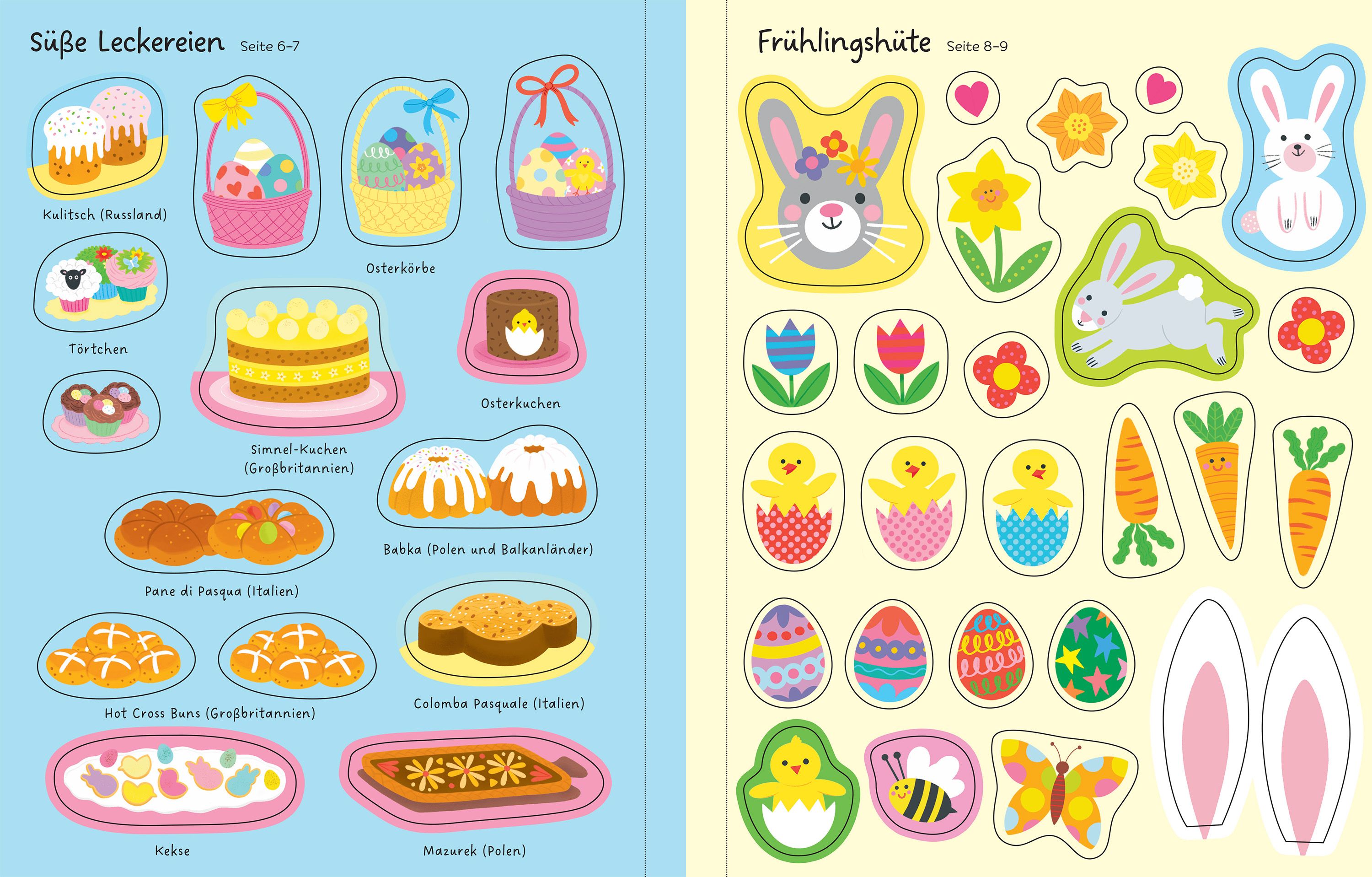 Hier ist Osterspaß garantiert! Mit über 150 Stickern kannst du Ostereier verzieren, eine Bäckerei mit traditionellen Leckereien aus aller Welt füllen, lustige Frühlingshüte gestalten und vieles mehr.