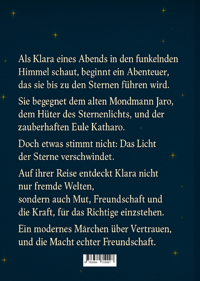 Eine Erzählung über ein märchenhaftes Abenteuer, das Themen wie Mut, Freundschaft und die Magie der Sterne behandelt. Als Klara dem geheimnisvollen Mondmann Jaro begegnet, öffnet sich ihr eine Welt voller Wunder. Gemeinsam entdecken sie, dass selbst die Kleinsten großes bewirken können. Eine Geschichte zum Vorlesen und Träumen.