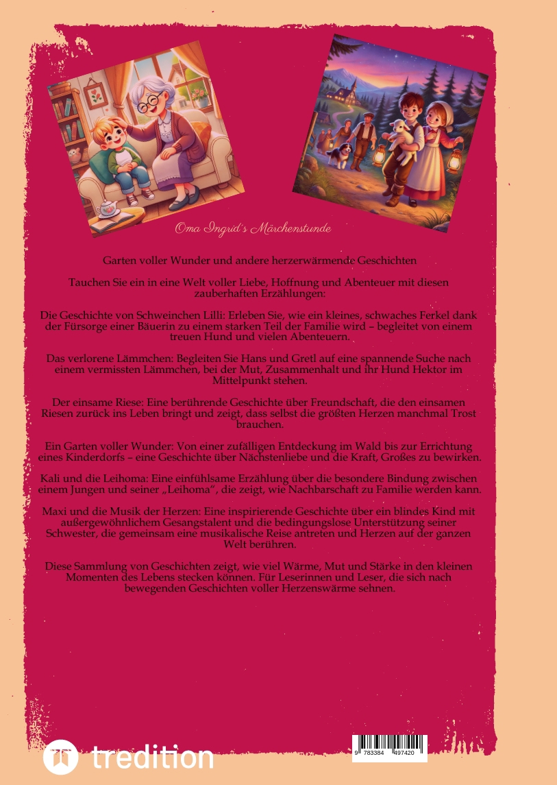 Ein Garten voller Wunder und andere herzerwärmende GeschichtenTauchen Sie ein in eine Welt voller Liebe, Hoffnung und Abenteuer mit diesen zauberhaften Erzählungen:Die Geschichte von Schweinchen Lilli: Erleben Sie, wie ein kleines, schwaches Ferkel dank der Fürsorge einer Bäuerin zu einem starken Teil der Familie wird - begleitet von einem treuen Hund und vielen Abenteuern.Das verlorene Lämmchen: Begleiten Sie Hans und Gretl auf eine spannende Suche nach einem vermissten Lämmchen, bei der Mut, Zusammenhalt und ihr Hund Hektor im Mittelpunkt stehen.Der einsame Riese: Eine berührende Geschichte über Freundschaft, die den einsamen Riesen zurück ins Leben bringt und zeigt, dass selbst die größten Herzen manchmal Trost brauchen.Ein Garten voller Wunder: Von einer zufälligen Entdeckung im Wald bis zur Errichtung eines Kinderdorfs - eine Geschichte über Nächstenliebe und die Kraft, Großes zu bewirken.Kali und die Leihoma: Eine einfühlsame Erzählung über die besondere Bindung zwischen einem Jungen und seiner "Leihoma", die zeigt, wie Nachbarschaft zu Familie werden kann.Maxi und die Musik der Herzen: Eine inspirierende Geschichte über ein blindes Kind mit außergewöhnlichem Gesangstalent und die bedingungslose Unterstützung seiner Schwester, die gemeinsam eine musikalische Reise antreten und Herzen auf der ganzen Welt berühren.Diese Sammlung von Geschichten zeigt, wie viel Wärme, Mut und Stärke in den kleinen Momenten des Lebens stecken können. Für Leserinnen und Leser, die sich nach bewegenden Geschichten voller Herzenswärme sehnen.