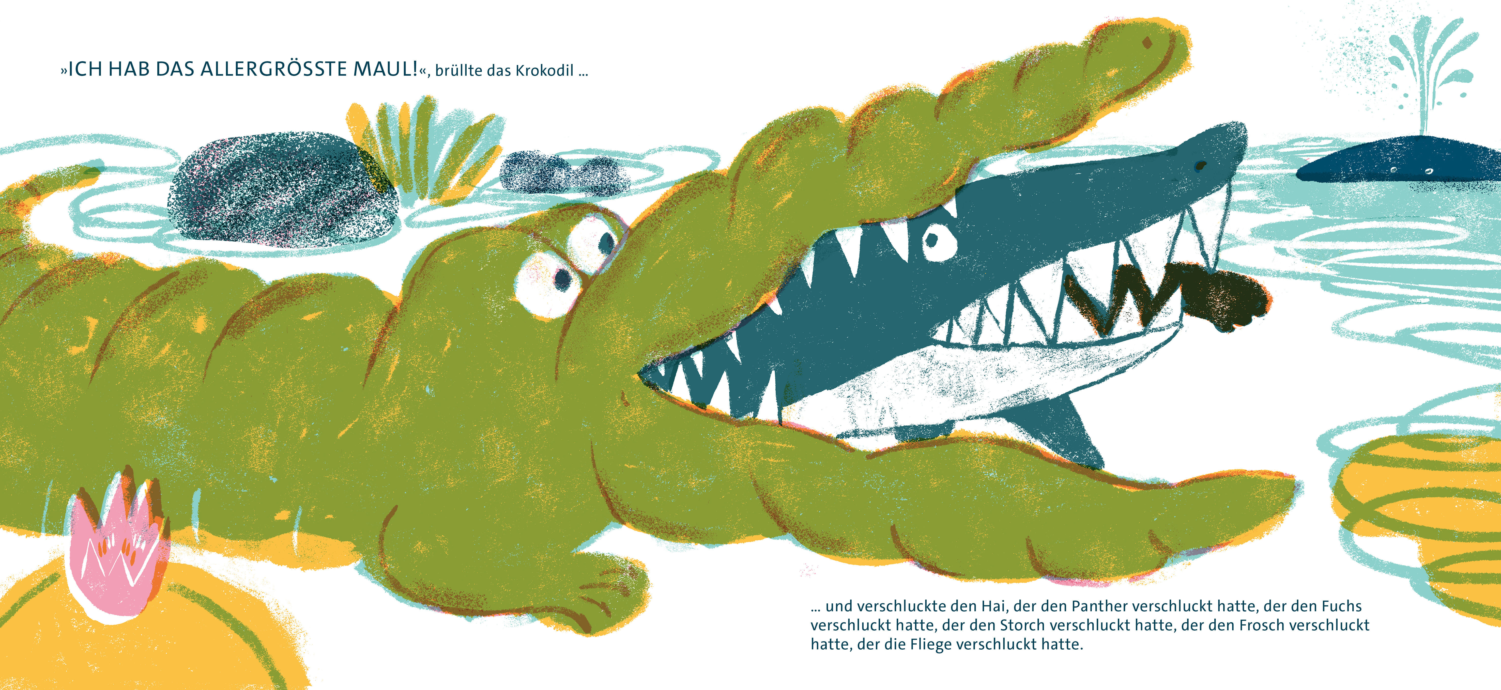 Der Frosch denkt, er sei der Größte am Seerosenteich und verschluckt mit einem Happs die Fliege, die summend ihre Kreise zieht. Doch wenn man sich auf eines verlassen kann, dann darauf, dass es immer ein noch größeres Großmaul gibt: Und so verschluckt der Storch den Frosch und der Fuchs den Storch. Und so geht es prahlerisch quer durch das Tierreich - bis der Walfisch die Angeberei beendet. Denn obwohl er bei Weitem das größte Maul hat, kann er Angebereien nicht leiden und sorgt dafür, dass alle Tiere wieder ausgespuckt werden. Zum Glück hatten alle trotzdem einen Riesenspaß, selbst die Fliege, die vor lauter Aufregung einen Schluckauf bekommt.