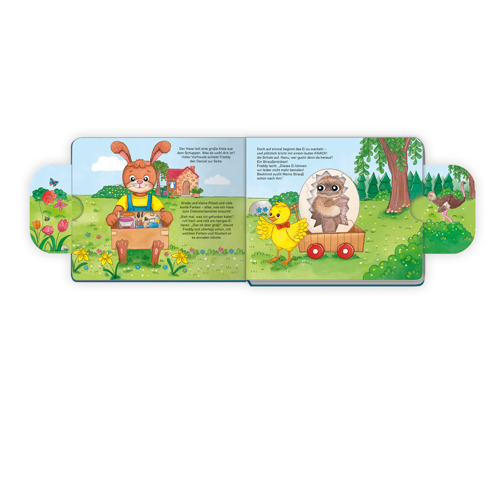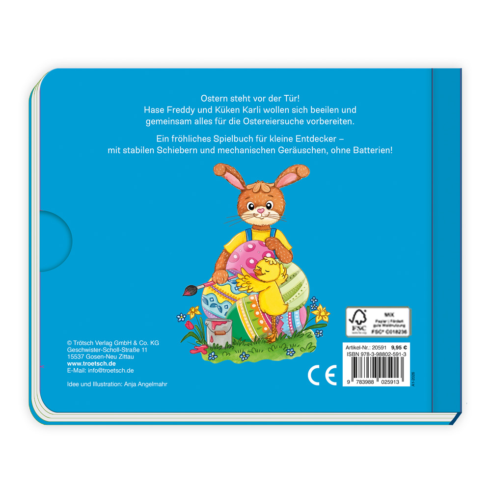 Ein fröhliches Spielbuch zum Bewegen und Vorlesen. In diesem tollen Pappbilderbuch können schon die Kleinsten Hase Freddy und Küken Karli bei den Vorbereitungen für die Ostereiersuche begleiten. Bewegliche Schieber auf jeder Seite laden zum Entdecken ein – und machen beim Bewegen Geräusche, ganz ohne Batterien! Ein schönes Spielbuch für die Osterzeit!