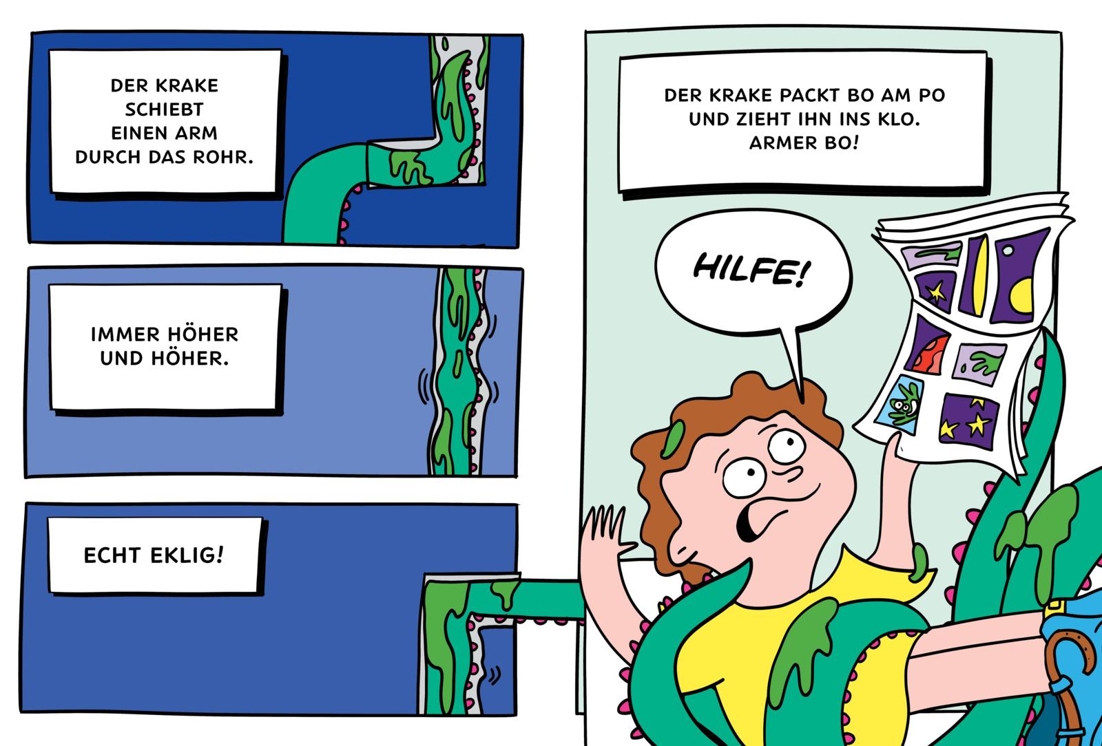 Bo genießt auf dem stillen Örtchen seine Ruhe! Nirgendwo sonst kann er so ungestört lesen und über seine Comics lachen. Doch diesmal hat er die Rechnung ohne den neugierigen Kanal-Kraken gemacht. Der möchte mitlachen - schwupps zieht er Bo ins Klo. Da unten müffelt es ziemlich, dafür ist aber einiges los! Ganz klolegial teilt Bo seinen Comic mit dem Kraken und hilft zwei traurigen Krokodilen furchteinflößend zu werden. Als er dann in einen Fechtkampf mit Nagetier Sabine verwickelt wird, heißt es: Comic oder Leben! Armer Bo! Schafft er es zurück aus dem Klo?